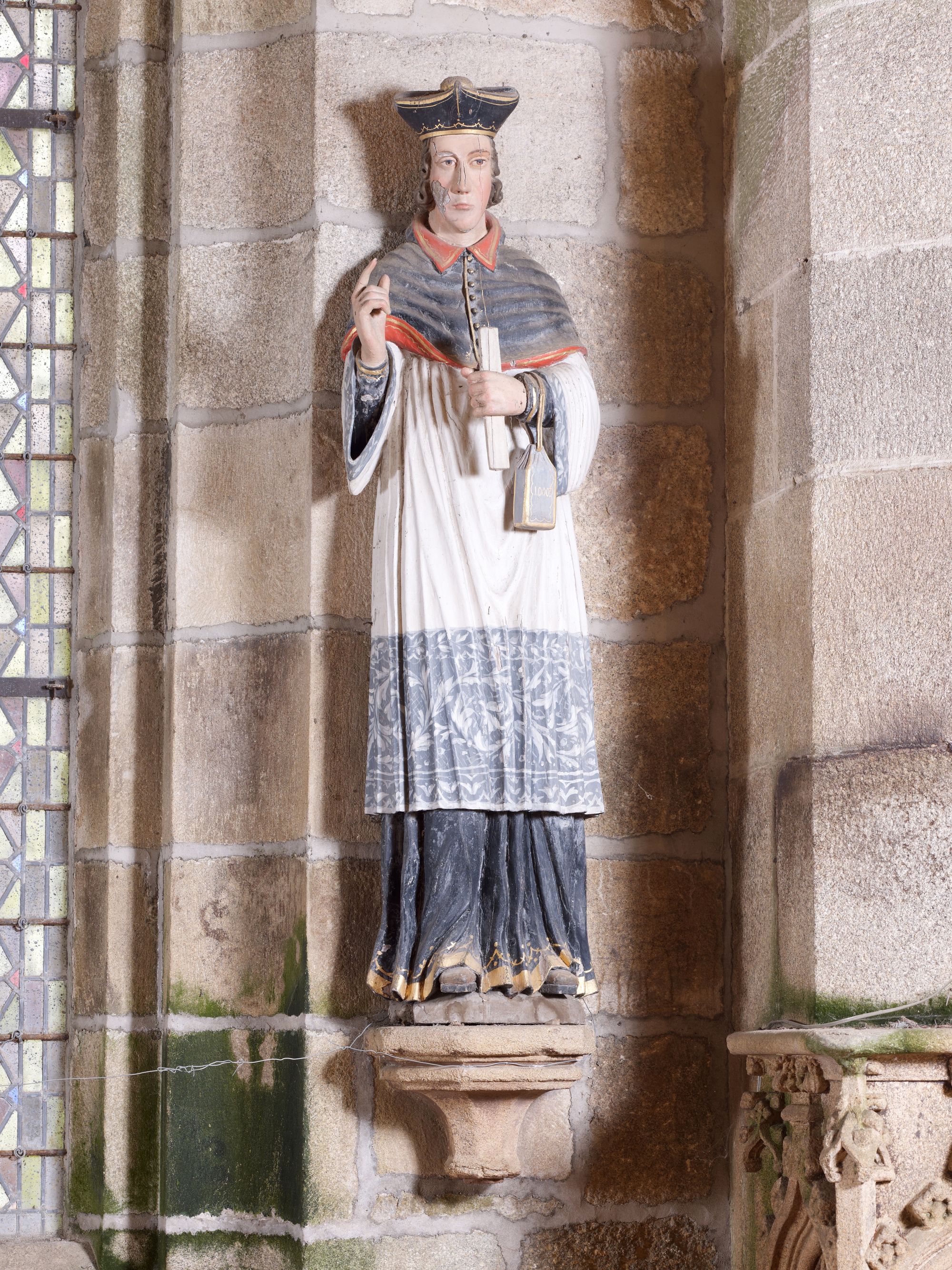 Tonquédec, le bourg : église paroissiale Saint-Pierre, vue intérieure, statue d'évêqueImmatriculation