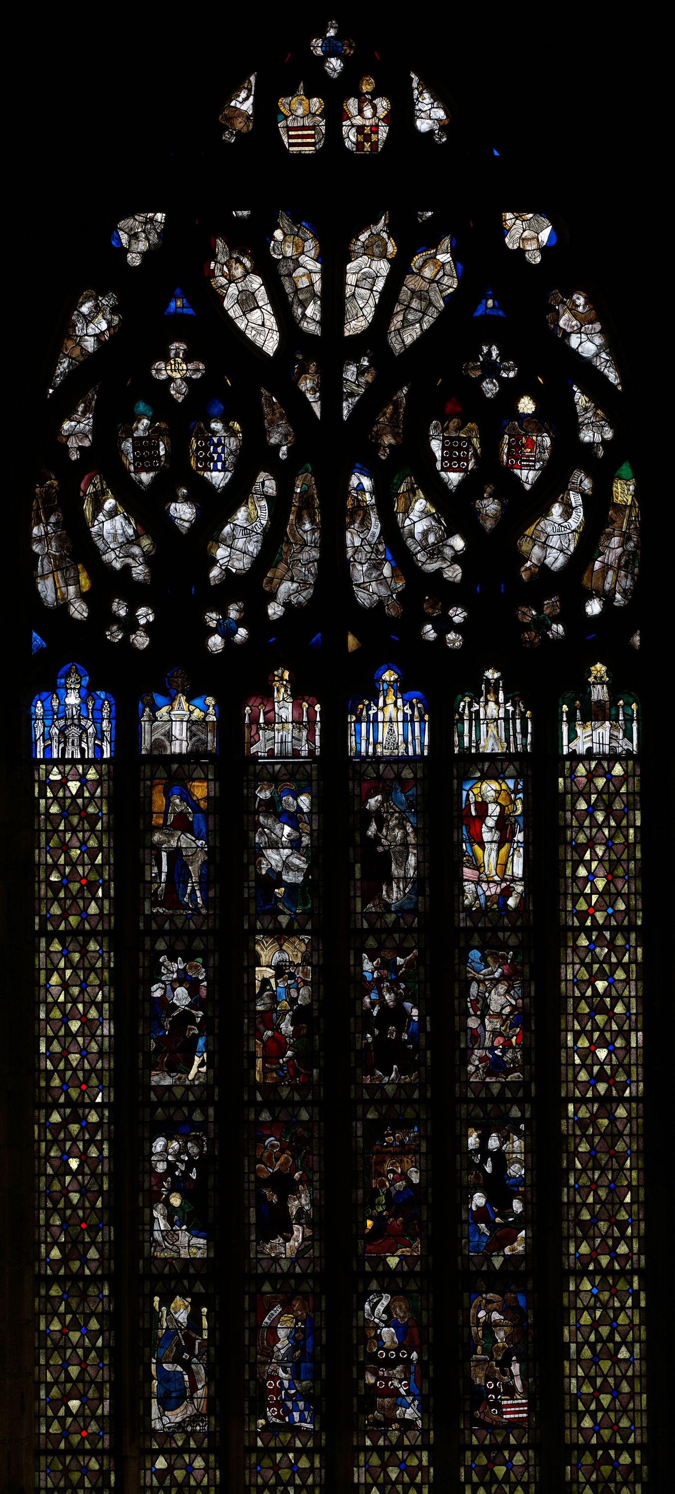 Tonquédec, le bourg : église paroissiale Saint-Pierre, vue intérieure, maîtresse-vitreImmatriculation