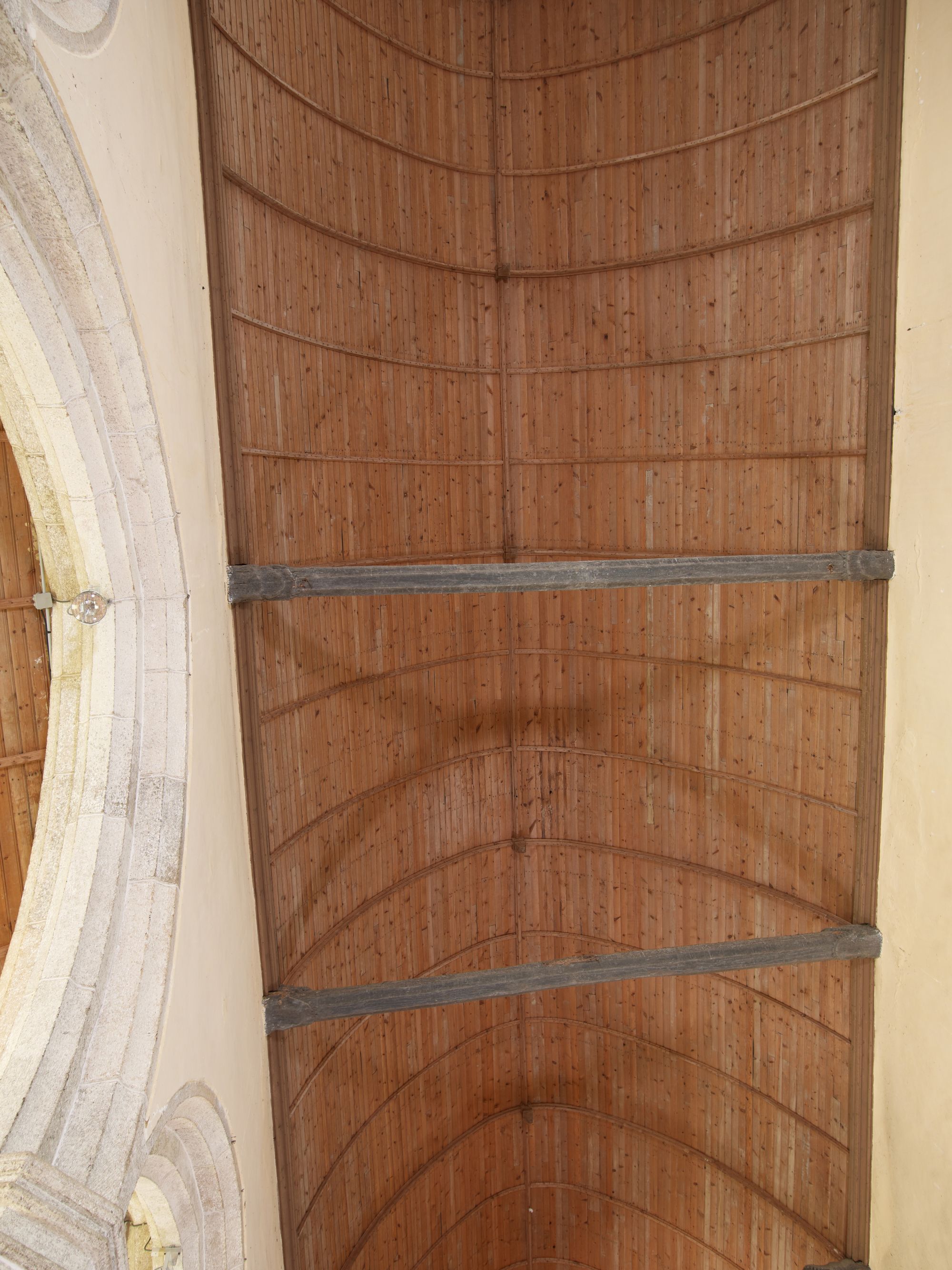 Tonquédec, le bourg : église paroissiale Saint-Pierre, vue intérieure, bas côtés nord, charpente et plafond lambrisséImmatriculation