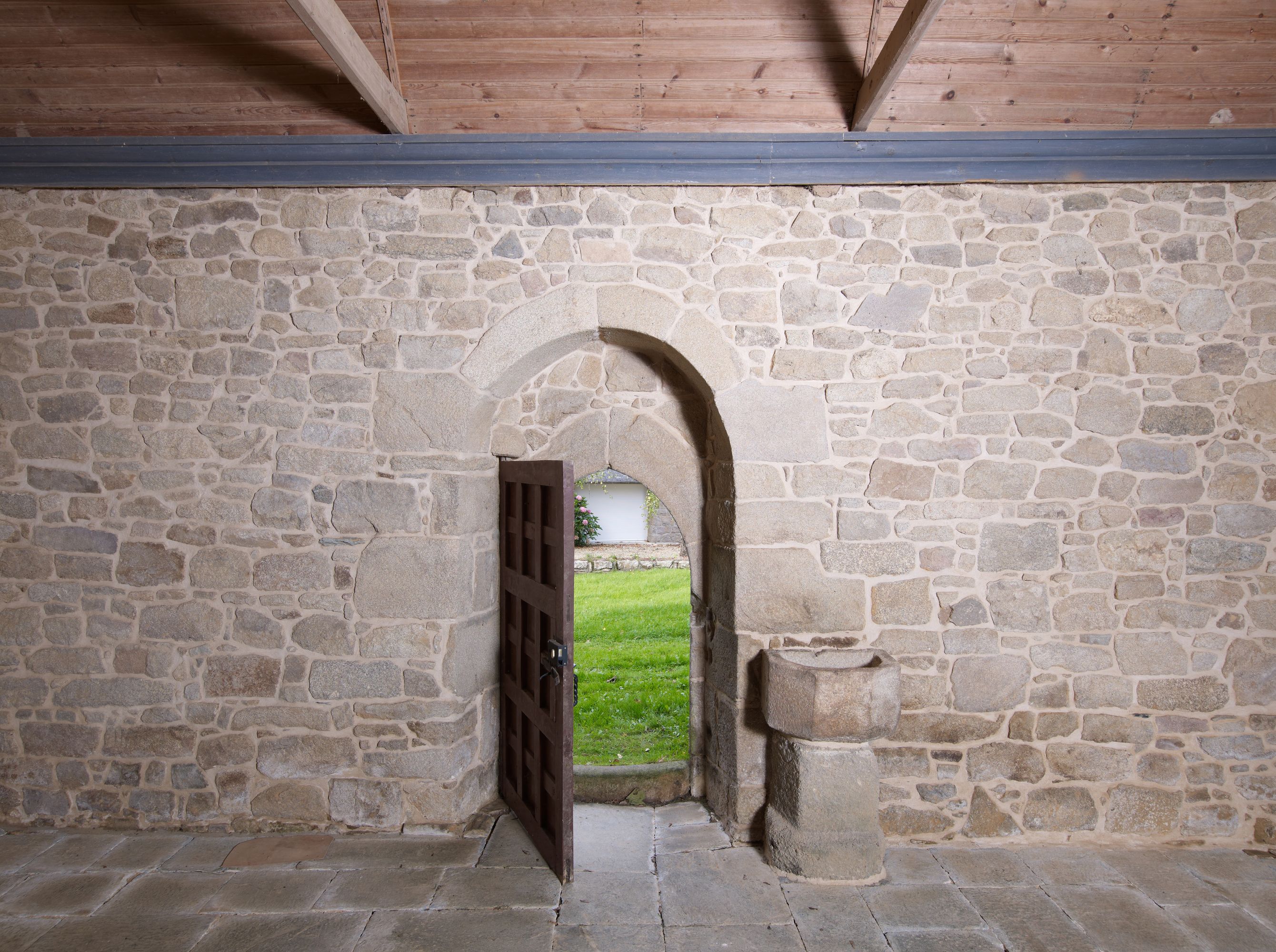 Tonquédec, Saint-Gildas : chapelle, vue intérieure, porte de la nef et bénitierImmatriculation