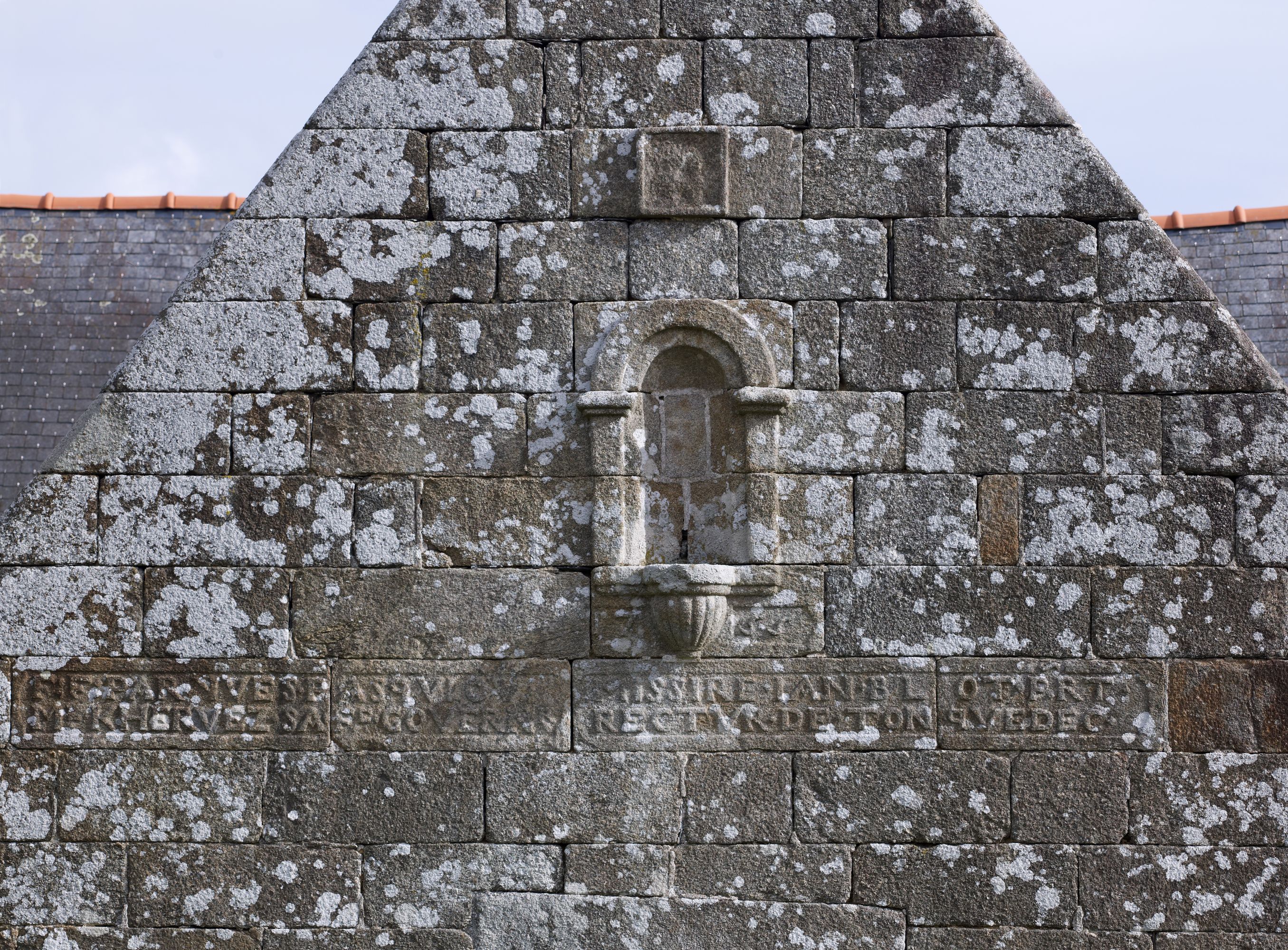 Tonquédec, le Loc : chapelle, porte ouest. On peu lire le millésime 1755 et l'inscription suivante : "F: F: PAR YVES PASQUIOU M. KERHERVES SA F[emm]e GOUERNr 1755 / MESSIRE IAN BLOT PR[évô]T RECTEUR DE TONQUEDEC"Immatriculation