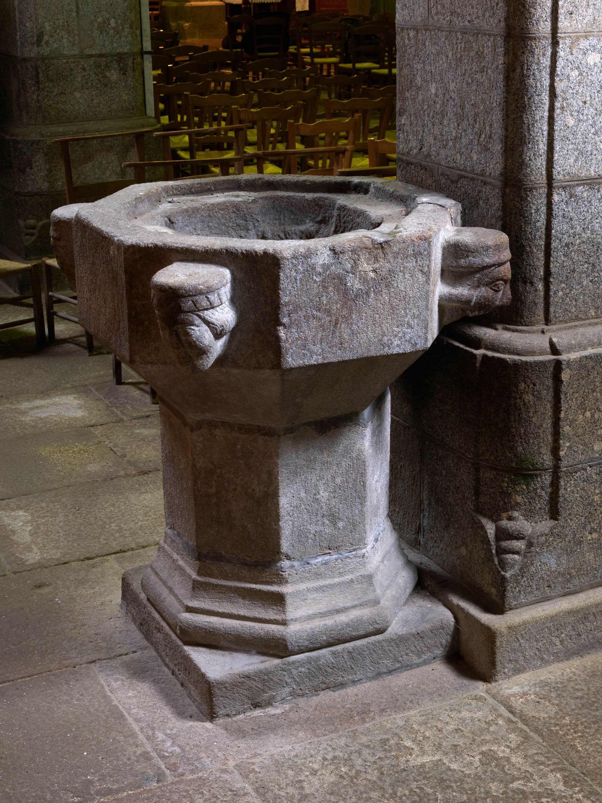 Langoat, le bourg : église paroissiale Sainte-Pompée, anciens fonts baptismaux (15e siècle : ?)Immatriculation