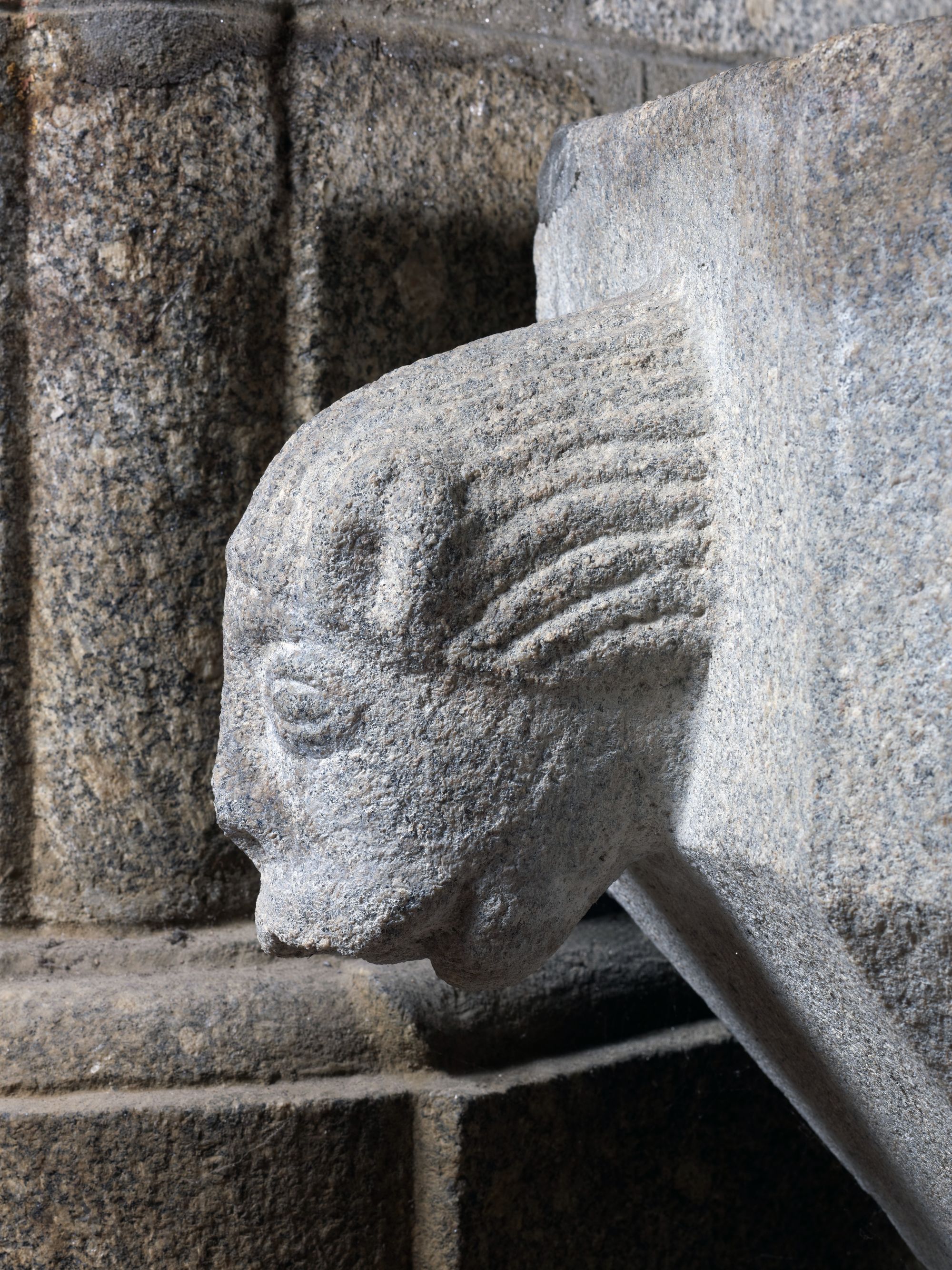 Langoat, le bourg : église paroissiale Sainte-Pompée, anciens fonts baptismaux (15e siècle : ?), vue de détailImmatriculation