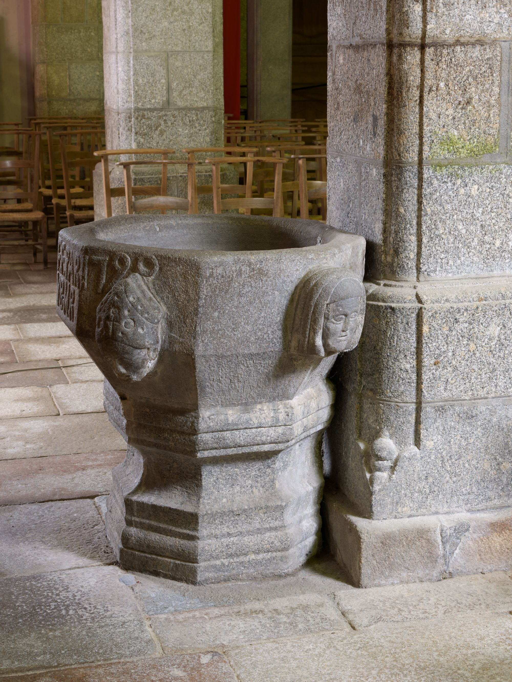 Langoat, le bourg : église paroissiale Sainte-Pompée, anciens fonts baptismaux. Décorés d'une tête d’évêque et d'une tête de religieuse, ils portent l'inscription et le millésime suivants : "F. F, PAR Y. B. M. R. 1790"Immatriculation