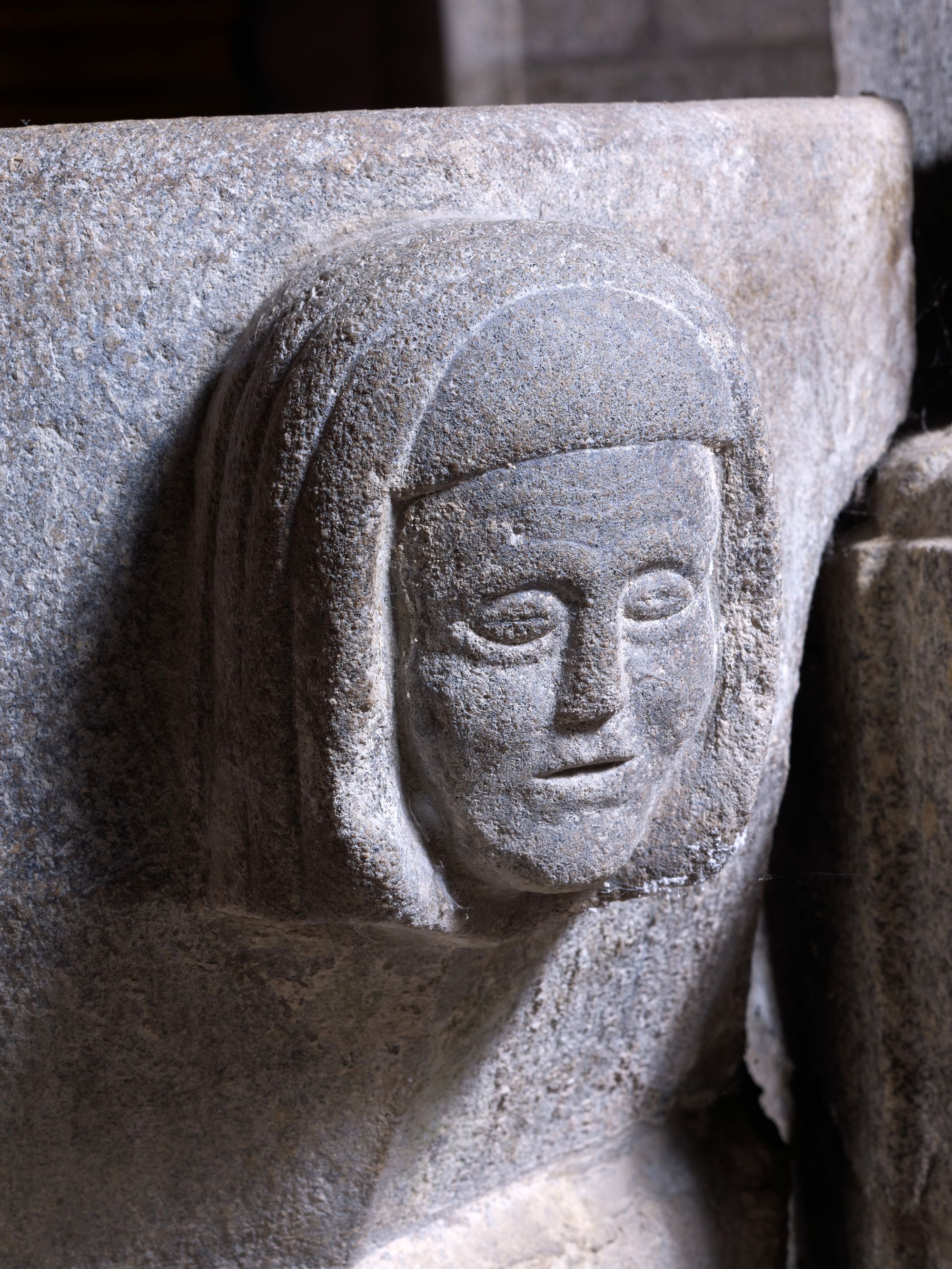 Langoat, le bourg : église paroissiale Sainte-Pompée, anciens fonts baptismaux. Décorés d'une tête d’évêque et d'une tête de religieuse, ils portent l'inscription et le millésime suivants : "F. F, PAR Y. B. M. R. 1790", vue de détailImmatriculation