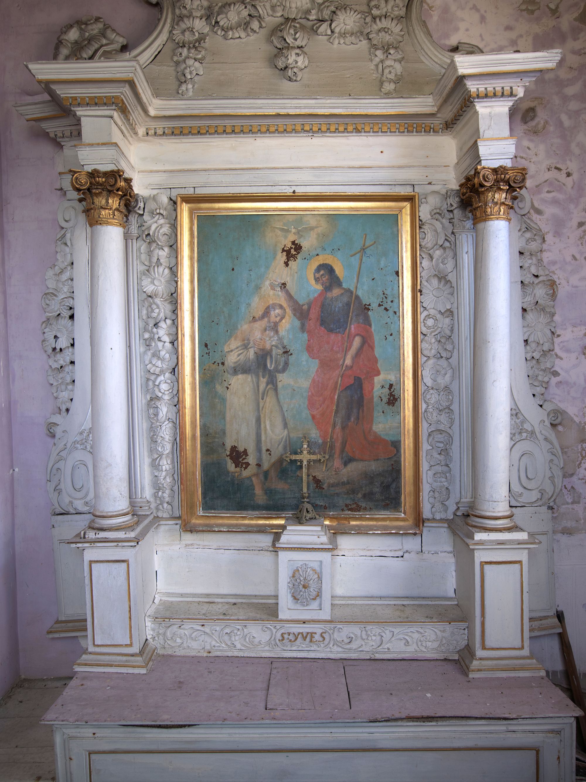 Langoat, le bourg : église paroissiale Sainte-Pompée, chapelle ouest dédiée à Saint-Yves, détail du retable et du tableauImmatriculation
