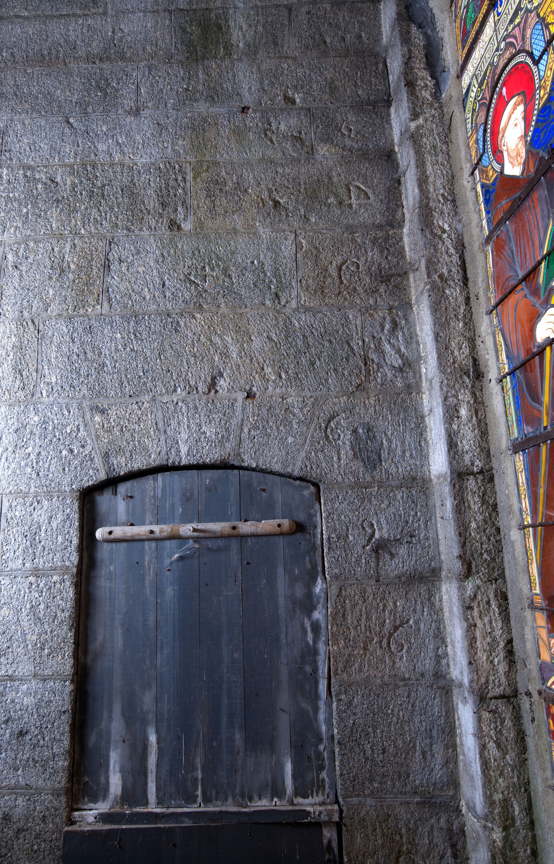 Langoat, le bourg : église paroissiale Sainte-Pompée, tour, appareillage en pierre de taille de granite portant des marques de tâcheronImmatriculation