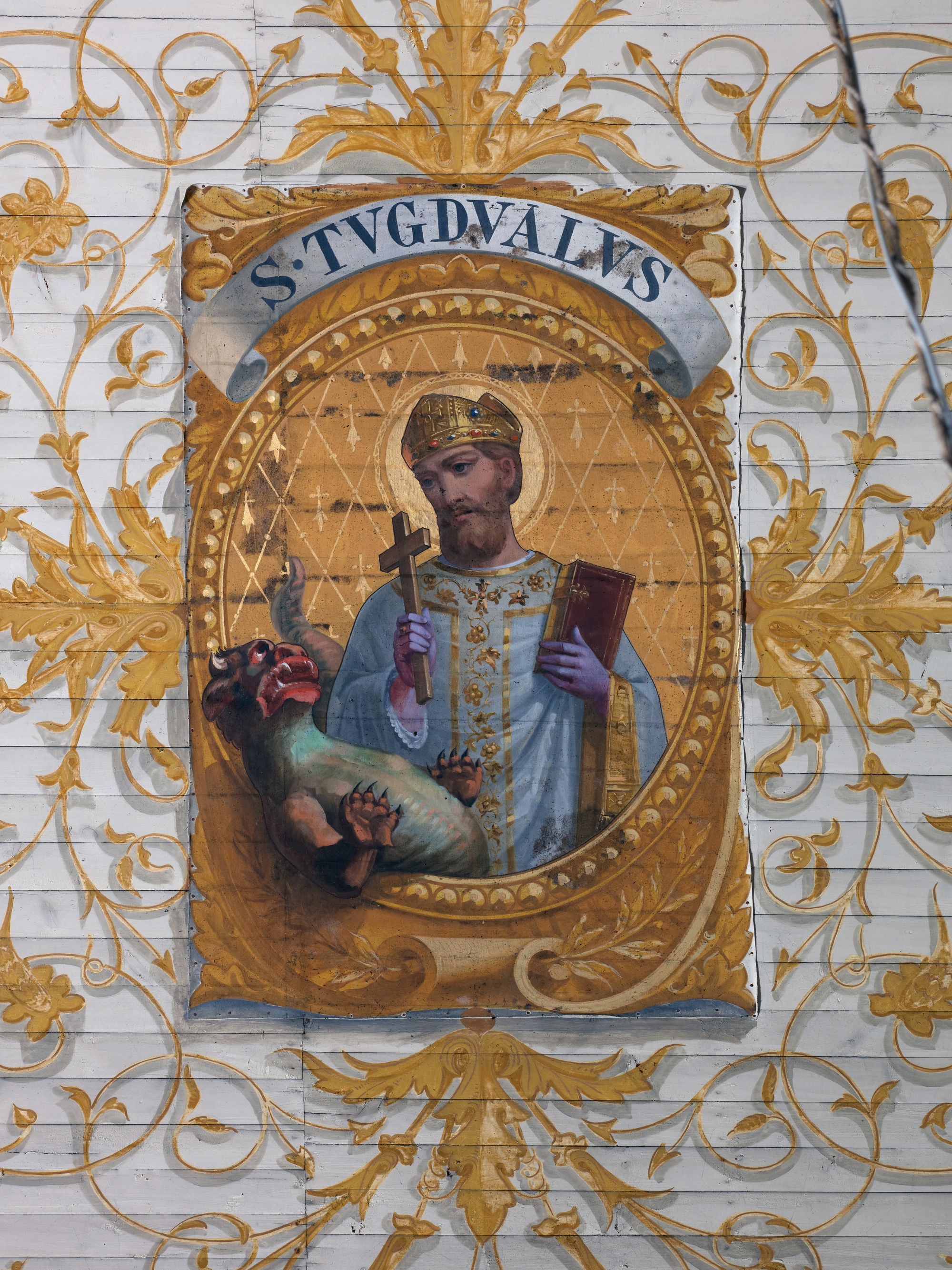 Langoat, le bourg : église paroissiale Sainte-Pompée, voûte lambrissée. Les toiles peintes sont clouées sur le lambris, ici Saint TugdualImmatriculation
