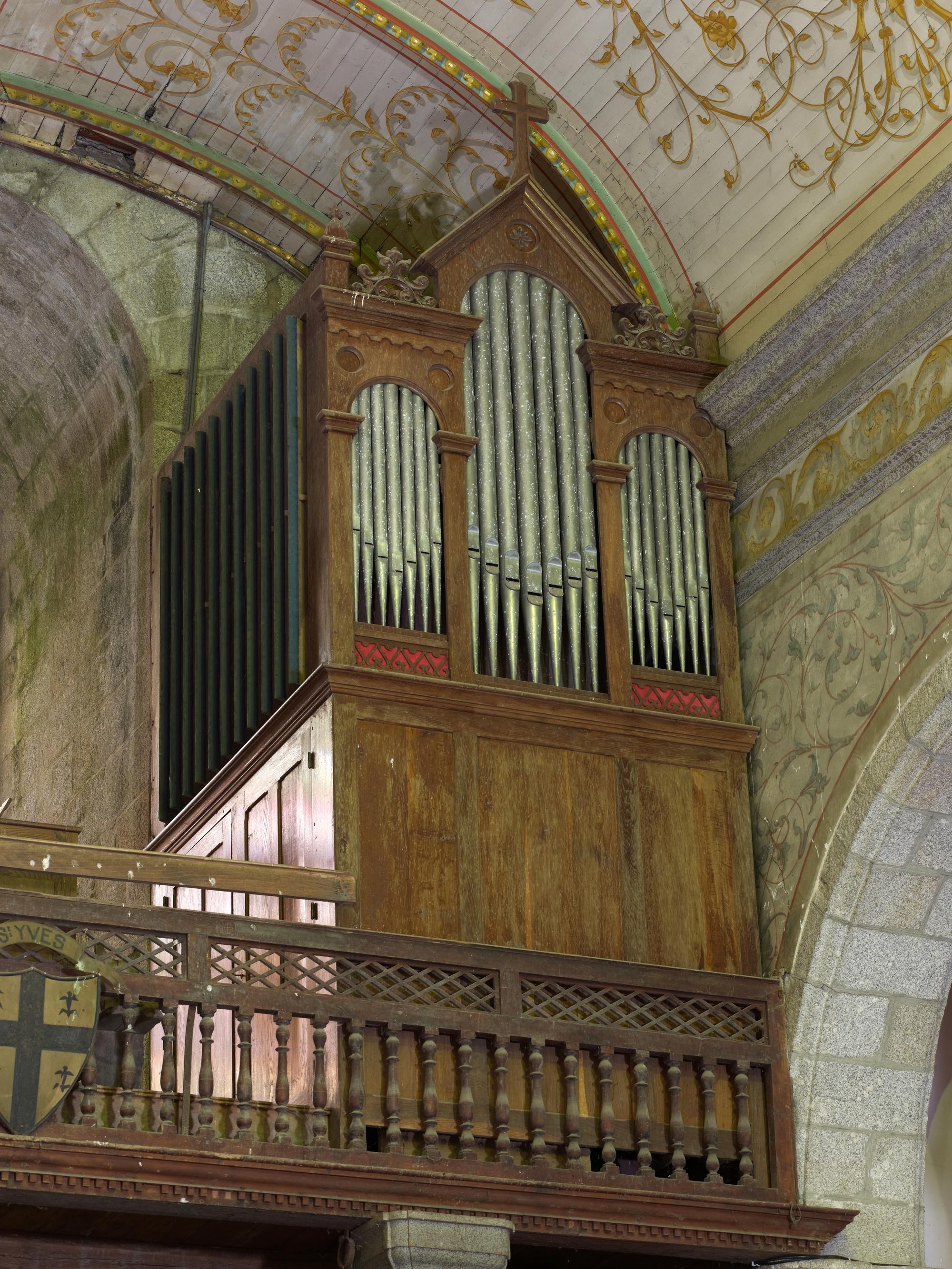 Langoat, le bourg : église paroissiale Sainte-Pompée, vue intérieure, orgue située sur la tribune. Il a été réalisé par Didier Van CasterImmatriculation