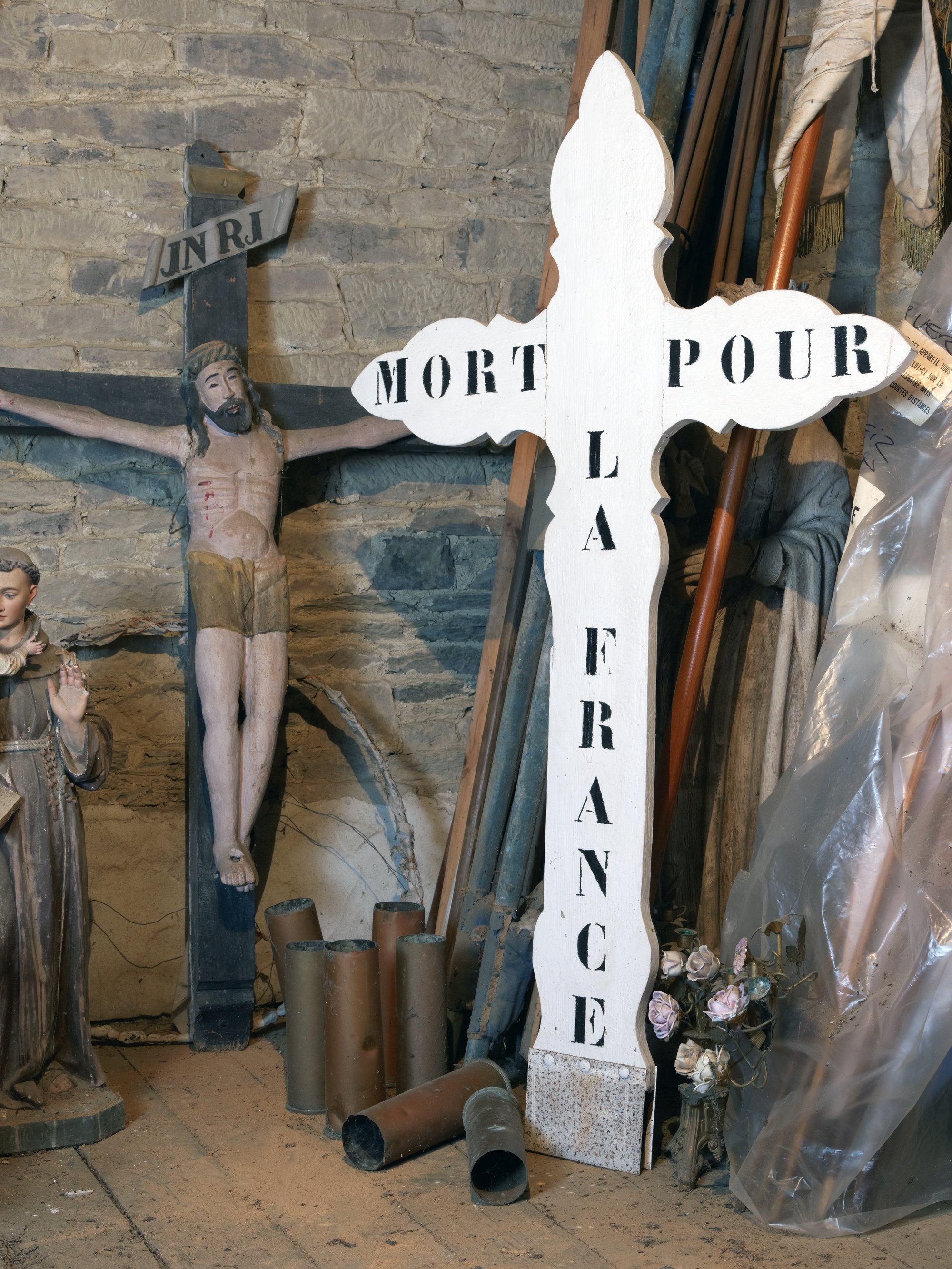 Langoat, le bourg : église paroissiale Sainte-Pompée, grenier de la sacristie, croix "Mort pour la France"Immatriculation