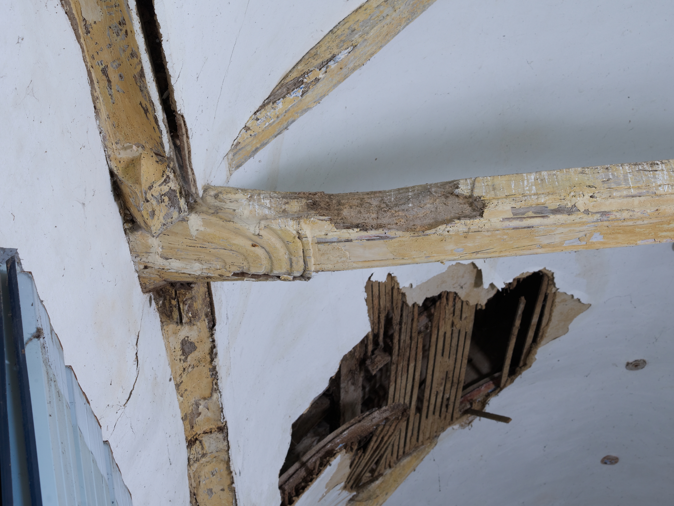 Langoat : chapelle Notre-Dame-du-Bois, intérieur, engoulant rongé par des insectes xylophagesImmatriculation