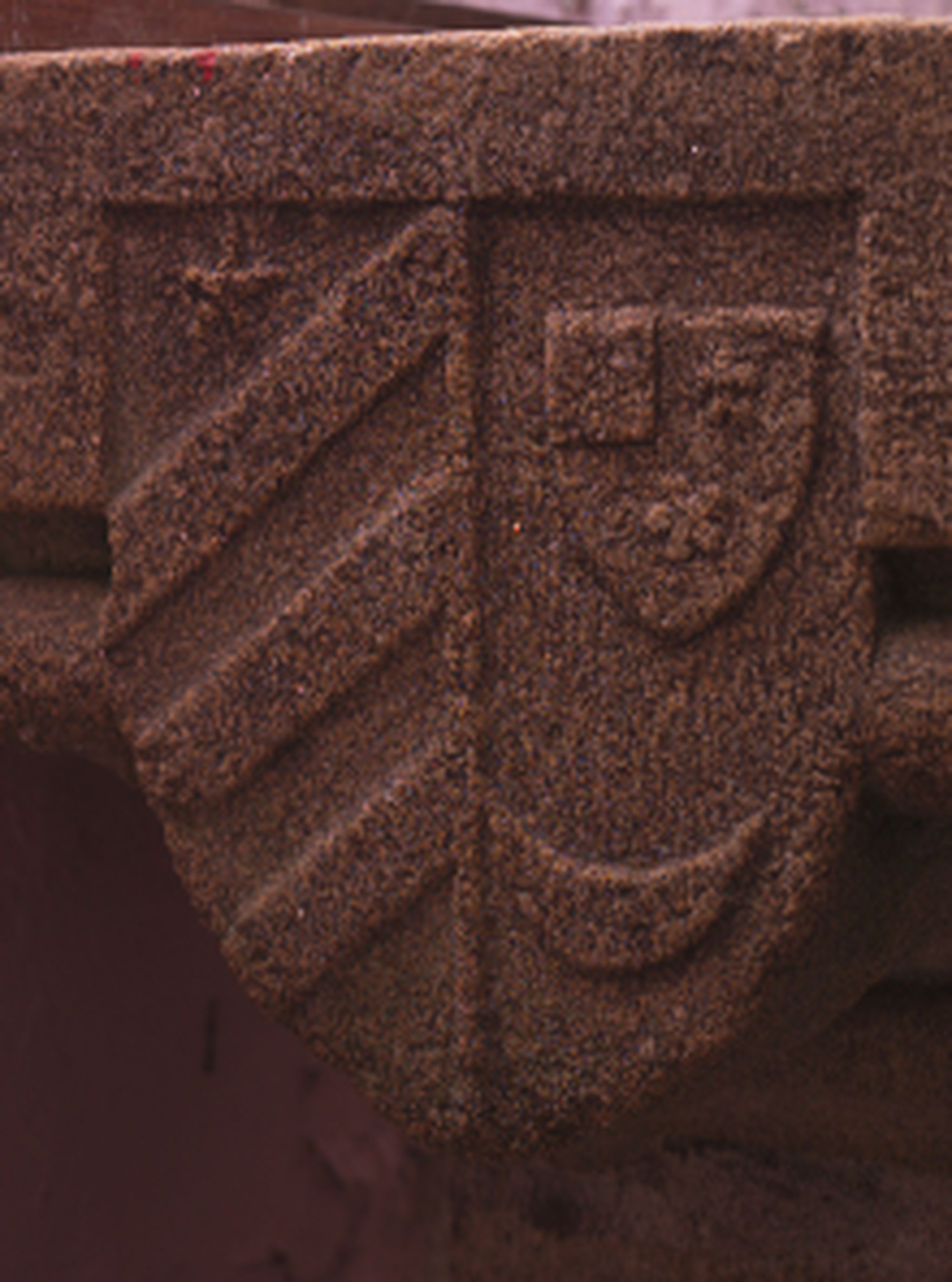 Fonts baptismaux. Détail des armoiries d'alliance de Guillaume de Ploeuc et de Marguerite de KerymerchImmatriculation