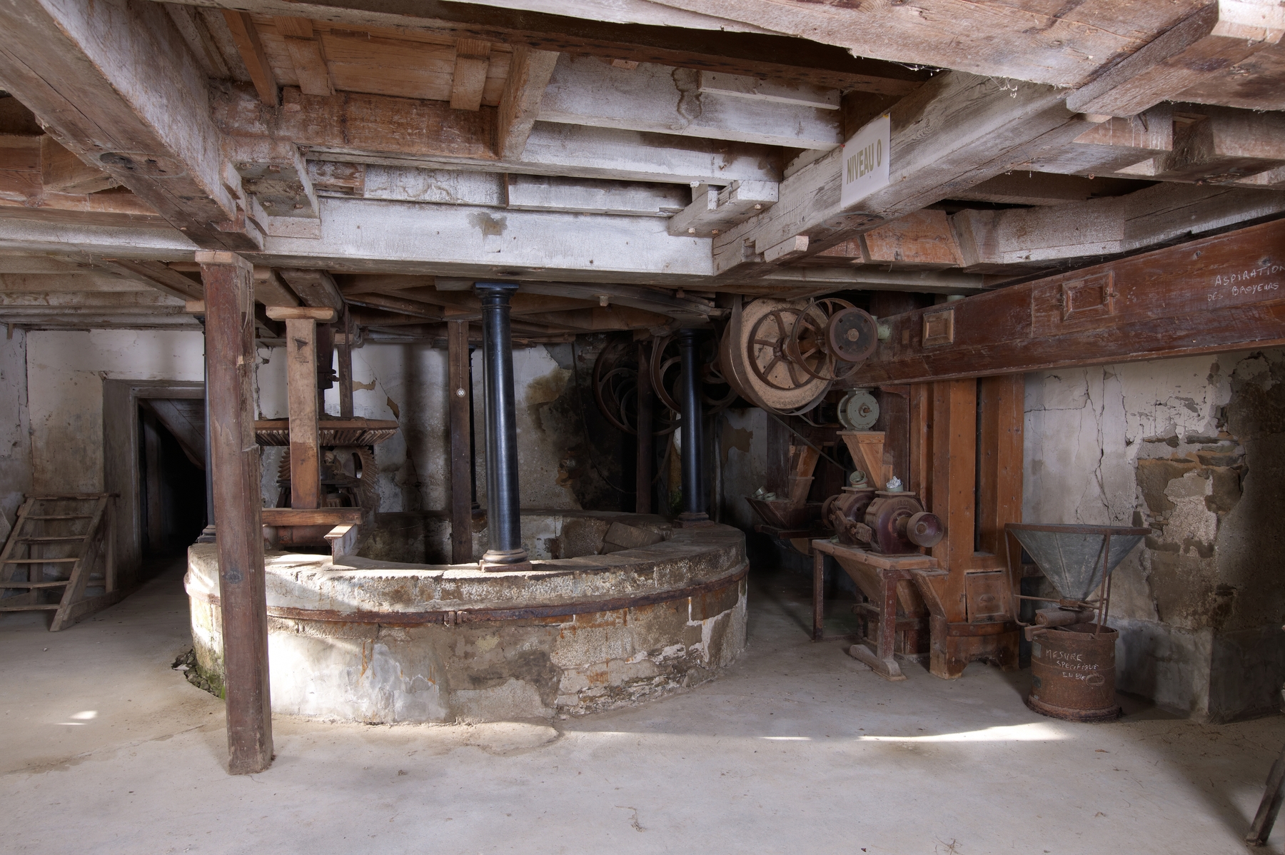 Corps central du moulin. Rez-de-chaussée. Rotonde, arbre de transmission, vis sans fin, élévateurs vers plansichter n°1 du 3e étage, détacheurs 1 et 2. Vue généraleImmatriculation