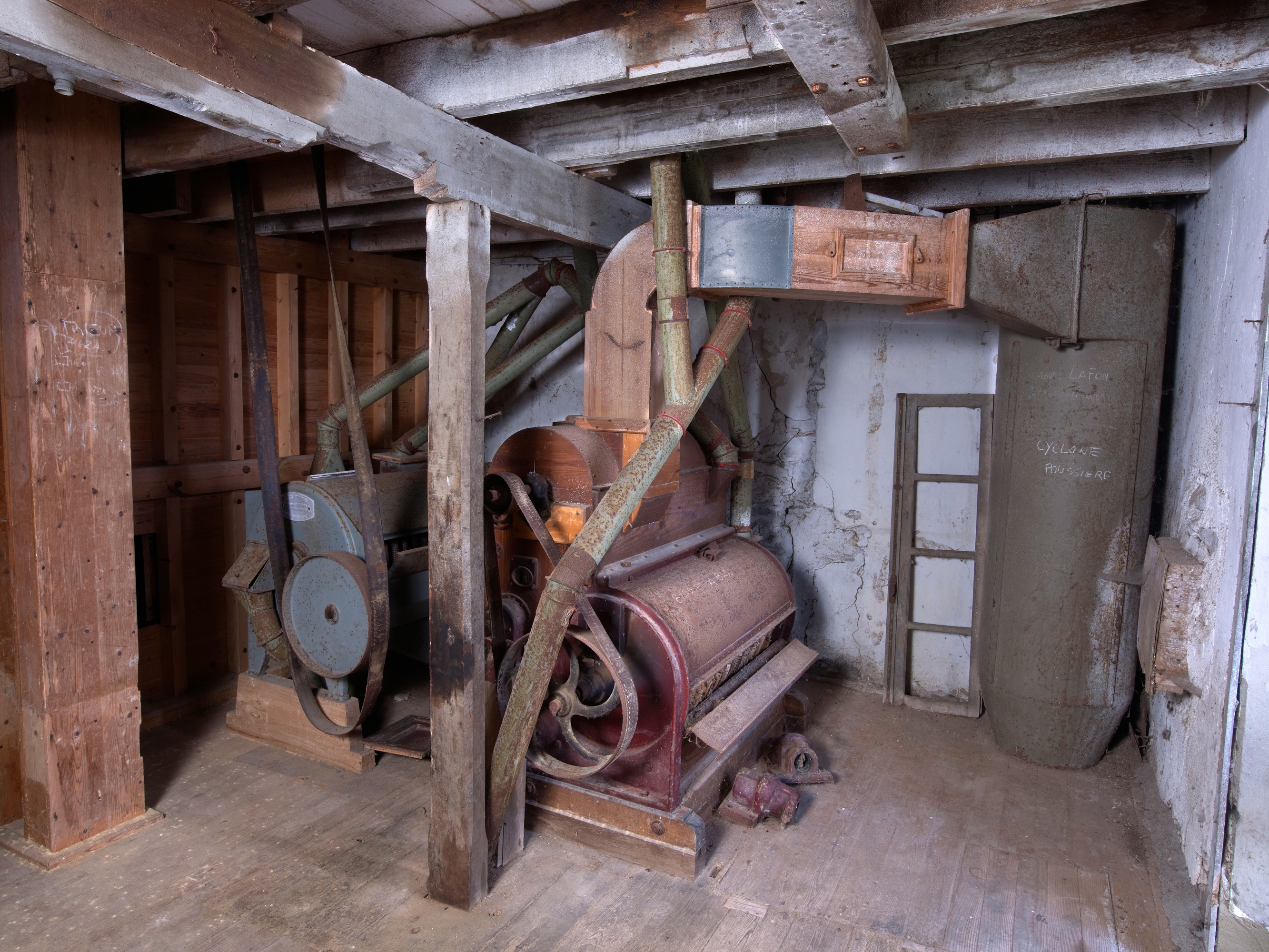 Corps central du moulin. Premier étage. Salle des silos. Trieur pour enlever les saletés mélangées aux grains, brosse à blé 1 pour ôter les mauvaises graines et les cailloux (appareils de chez HENRY SIMON) et cyclone pour aspirer la poussièreImmatriculation