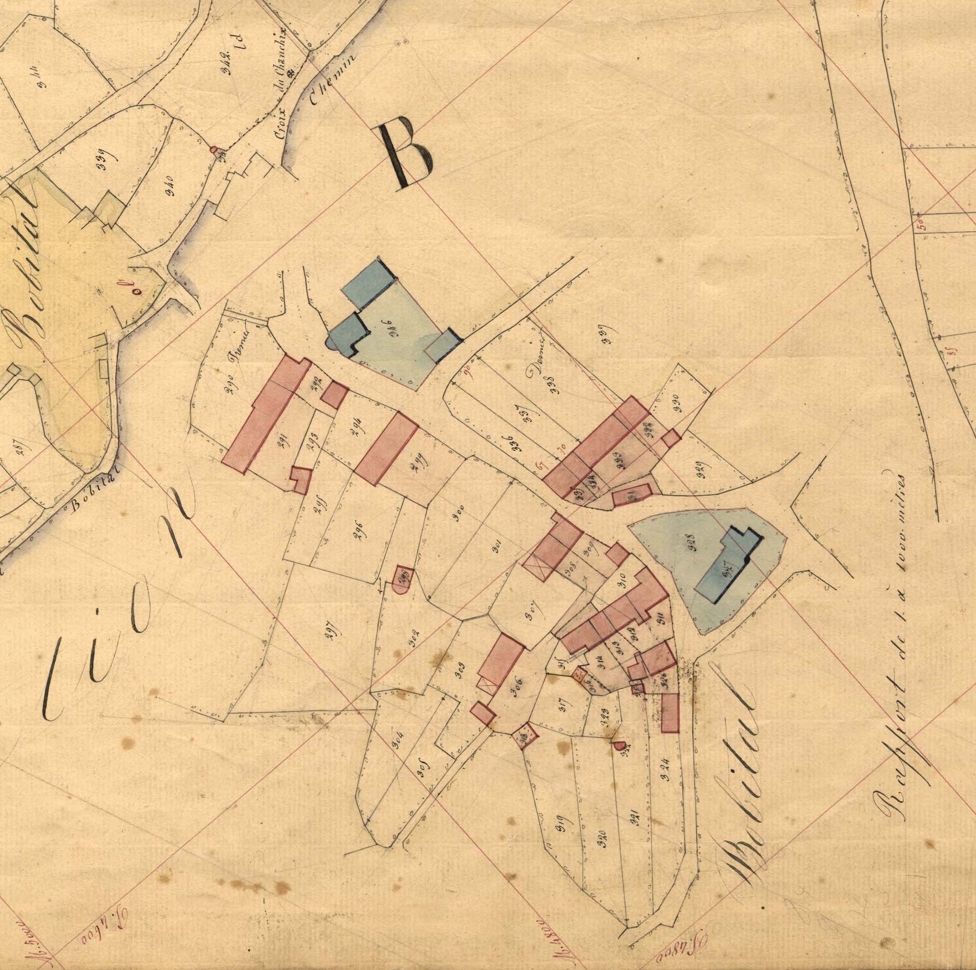 Extrait du plan cadastral du bourg en 1844, emplacement de l'ancienne église paroissialeImmatriculation