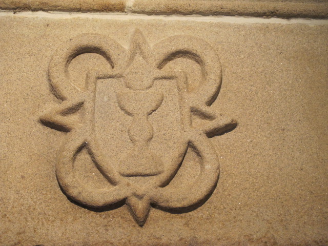 Linteau du manteau de cheminée portant un calice et une hostie dans un écuImmatriculation