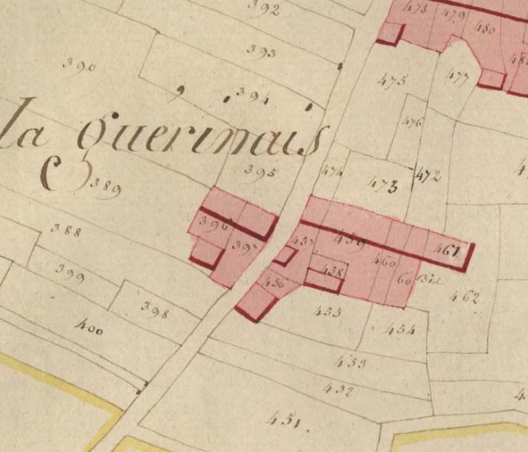 Extrait du cadastre de 1811, section B, exemple d'alignements de logis apartenant à plusieurs propriétairesImmatriculation