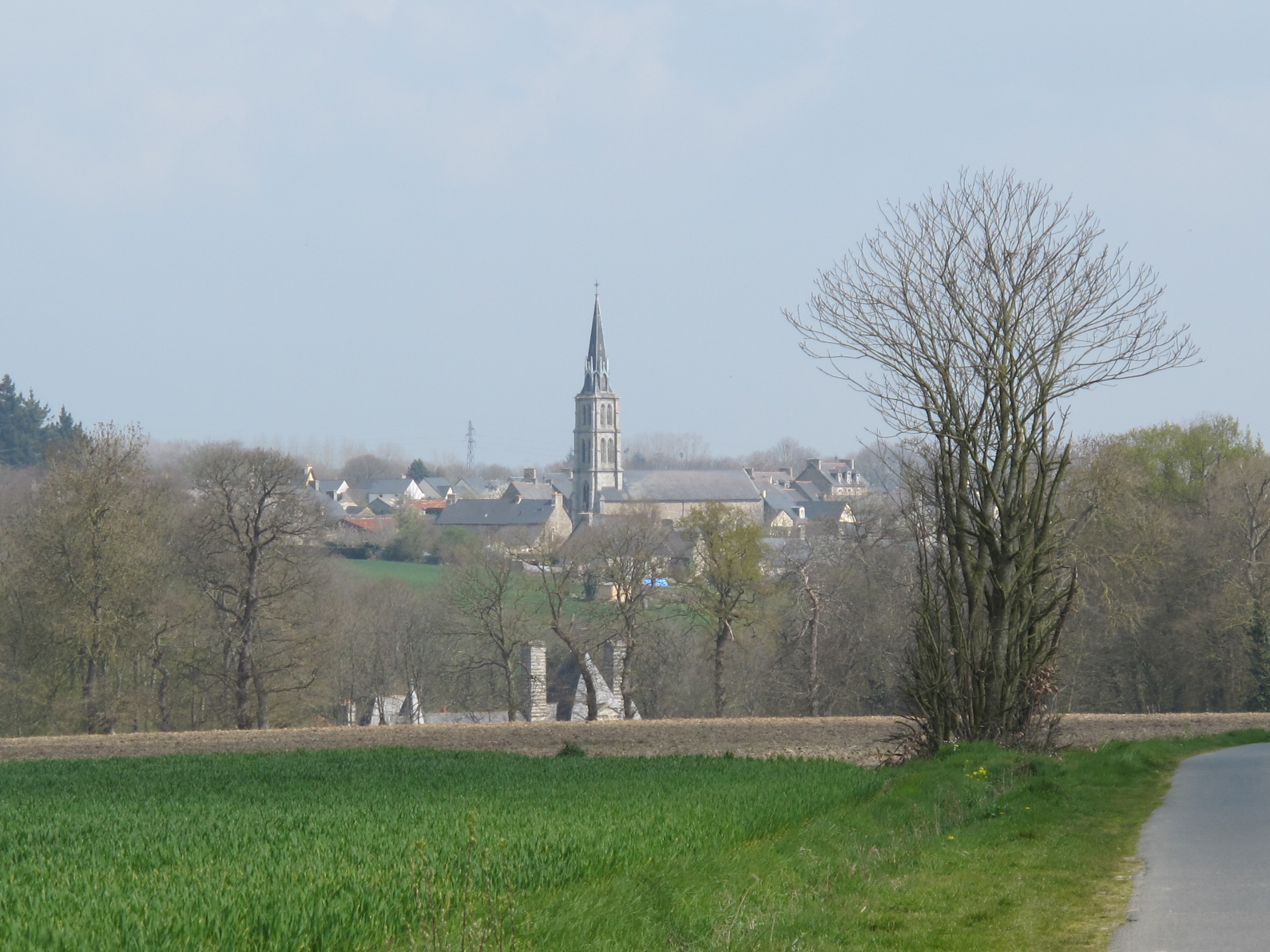 En bas dans la vallée, le château du Chalonge et ses hautes souches de cheminée et l'église paroissiale du village de TrévronImmatriculation