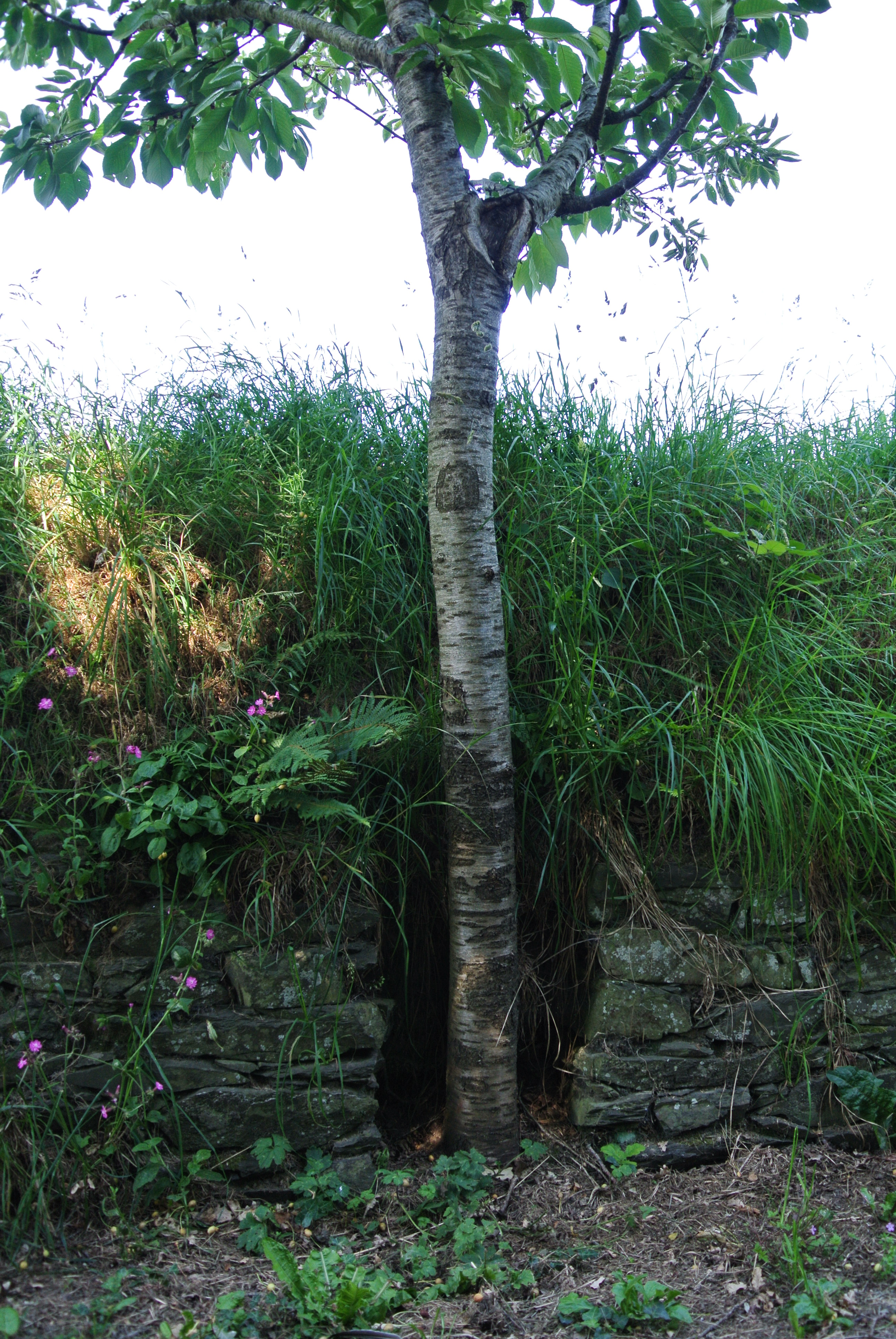Le Rojou (près de). Talus-mur planté de cerisiers. Détail d'une encoche pratiquée dans le mur-talusImmatriculation