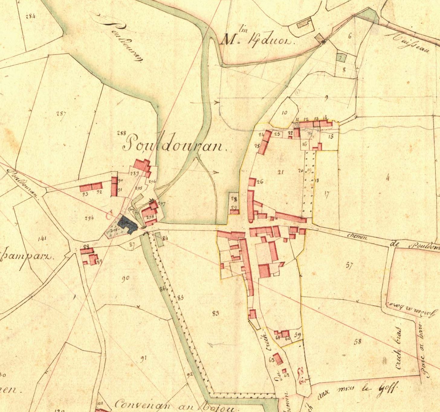 Le bourg de Pouldouran en 1835. Extrait du cadastre ancien (A.D. 22, sous-série 3P, section unique)Immatriculation