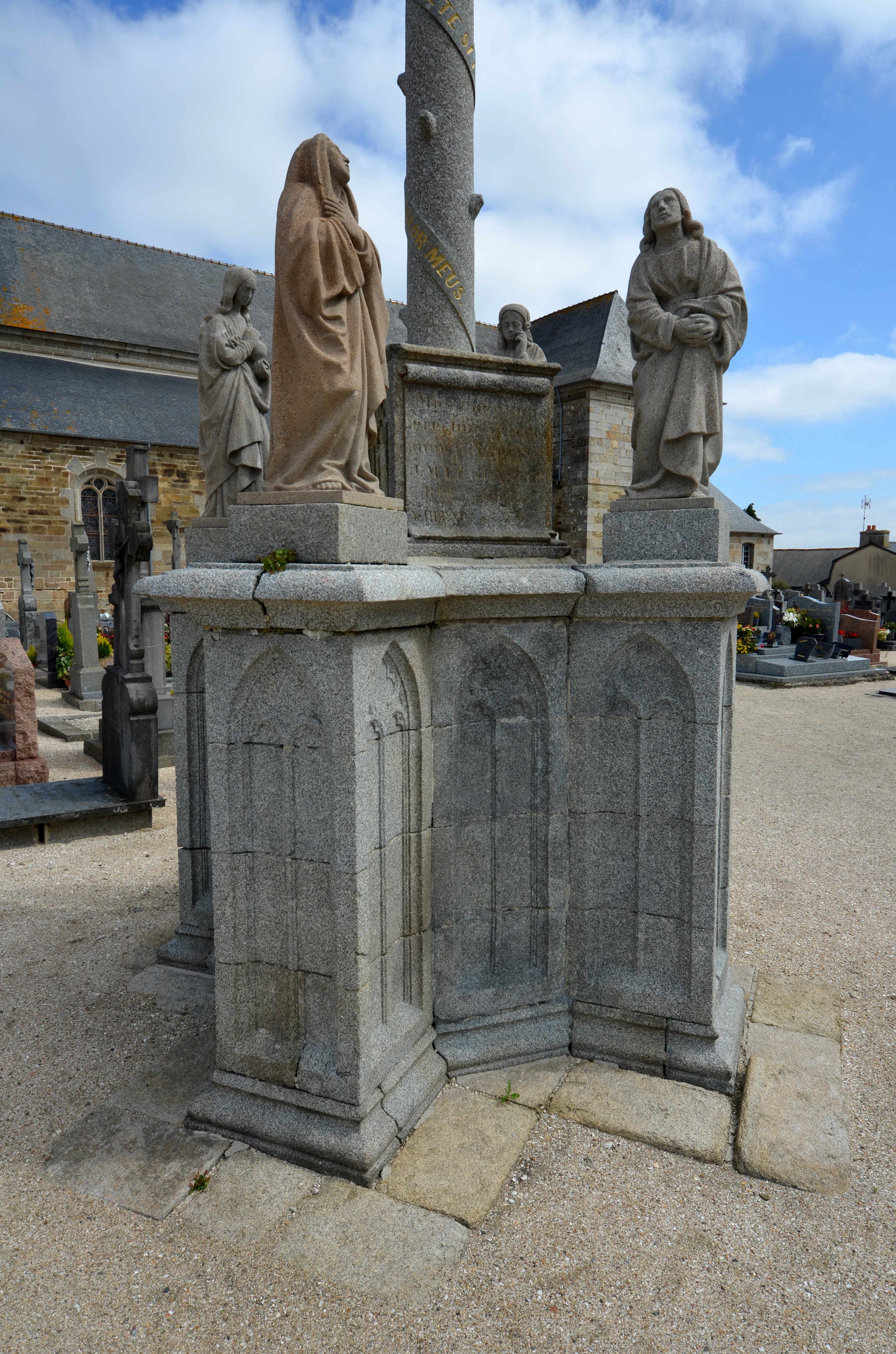 Langoat, le bourg : dans l'enclos de l'église paroissiale Sainte-Pompée, calvaire du cimetière, détail du piédestal et des quatre statuesImmatriculation