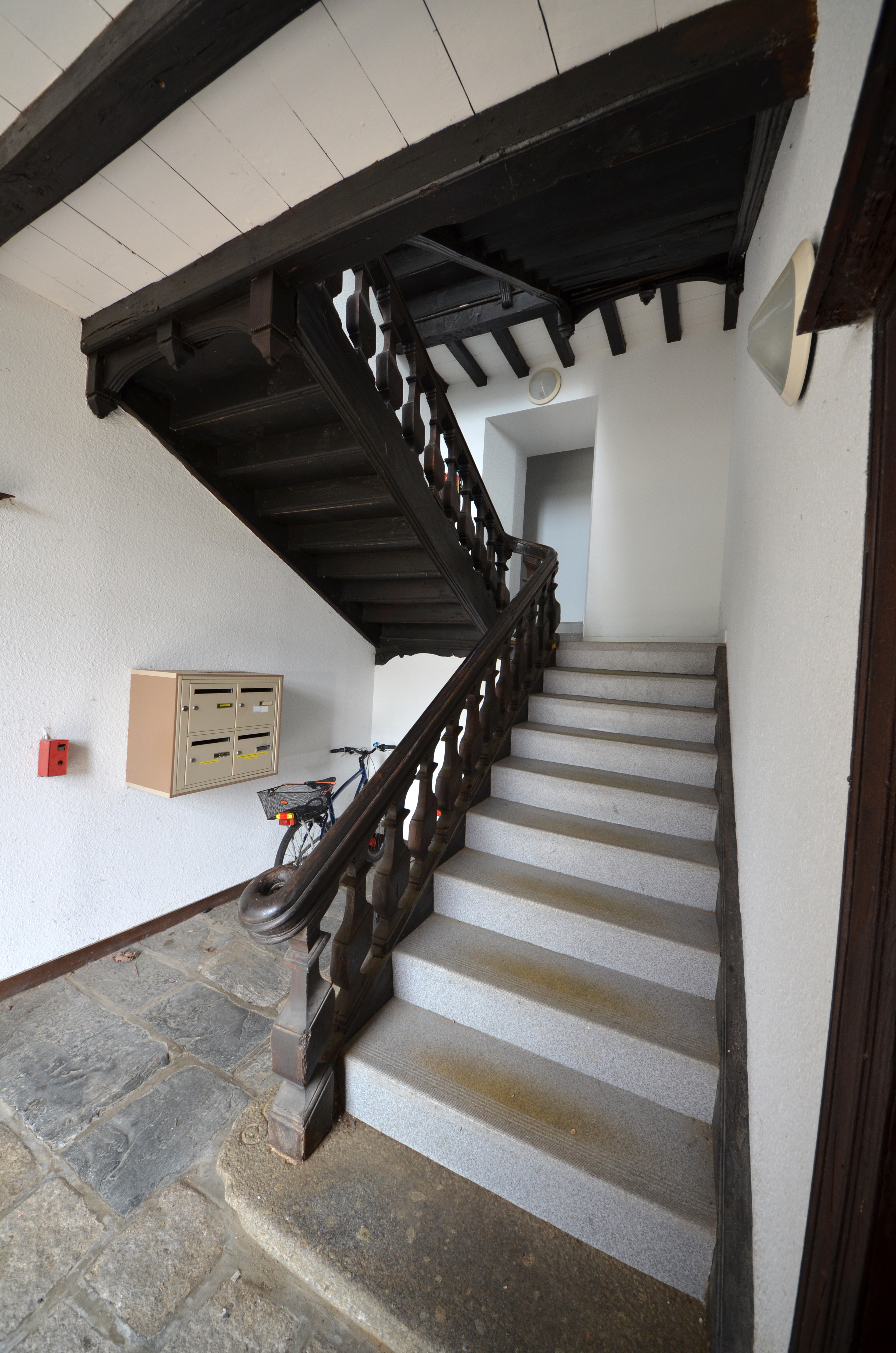 Langoat, le bourg : presbytère, intérieur, escalier rampe sur rampeImmatriculation