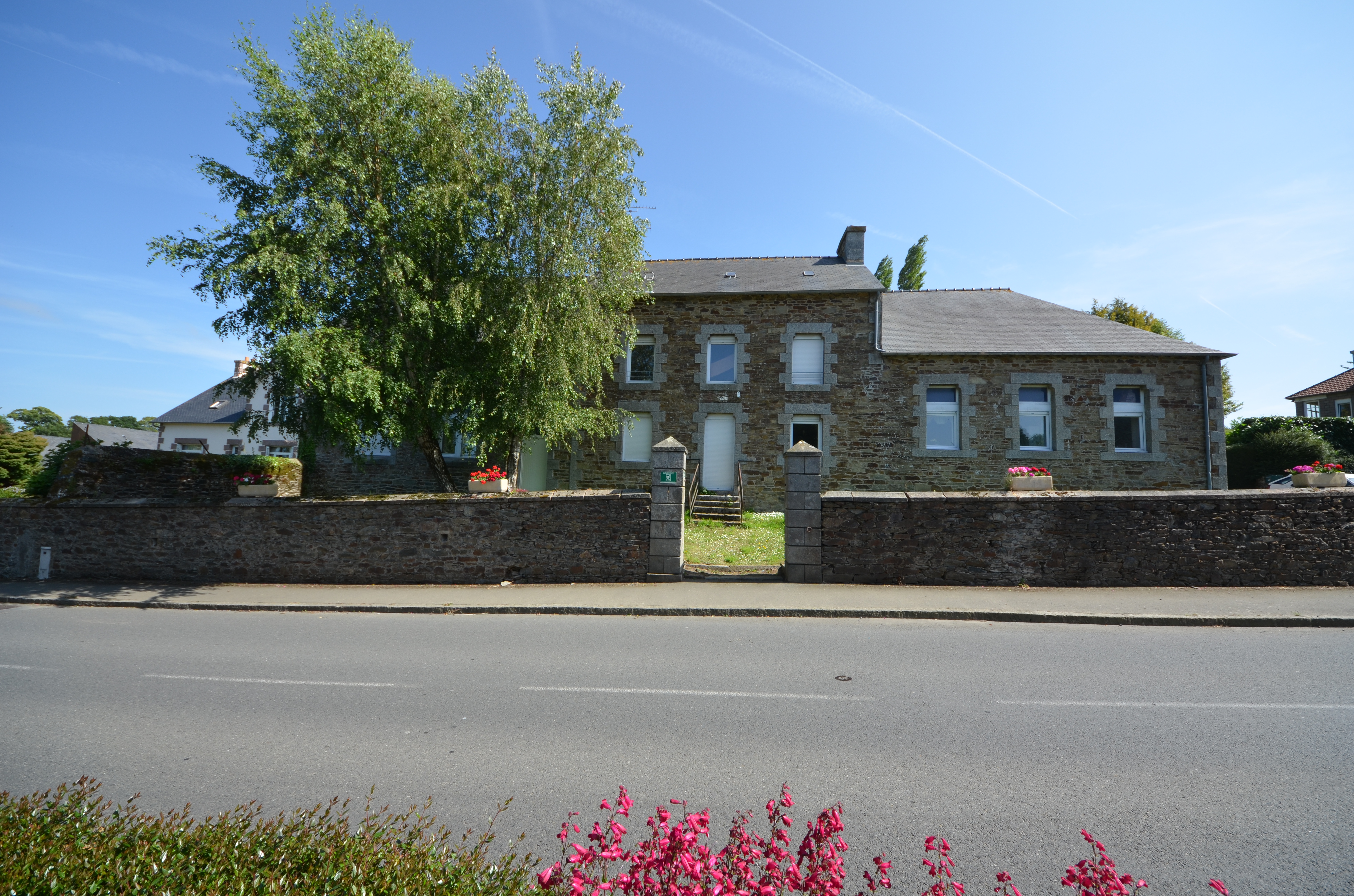 Langoat, le bourg, rue des Etangs : ancienne école primaire publique et mairie aujourd'hui logements, côté rue orientée vers le nord-ouestImmatriculation