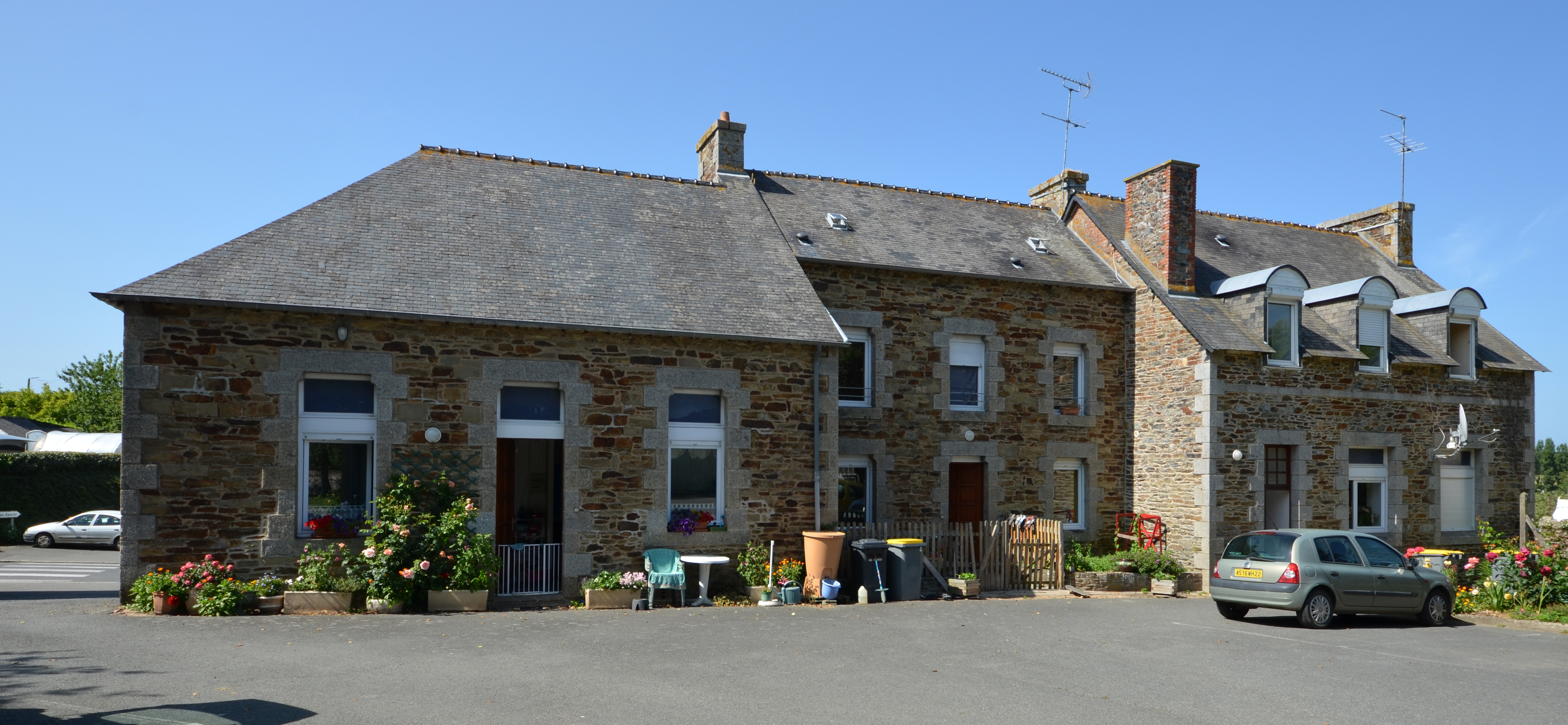 Langoat, le bourg, rue des Etangs : ancienne école primaire publique et mairie aujourd'hui logements, côté courImmatriculation