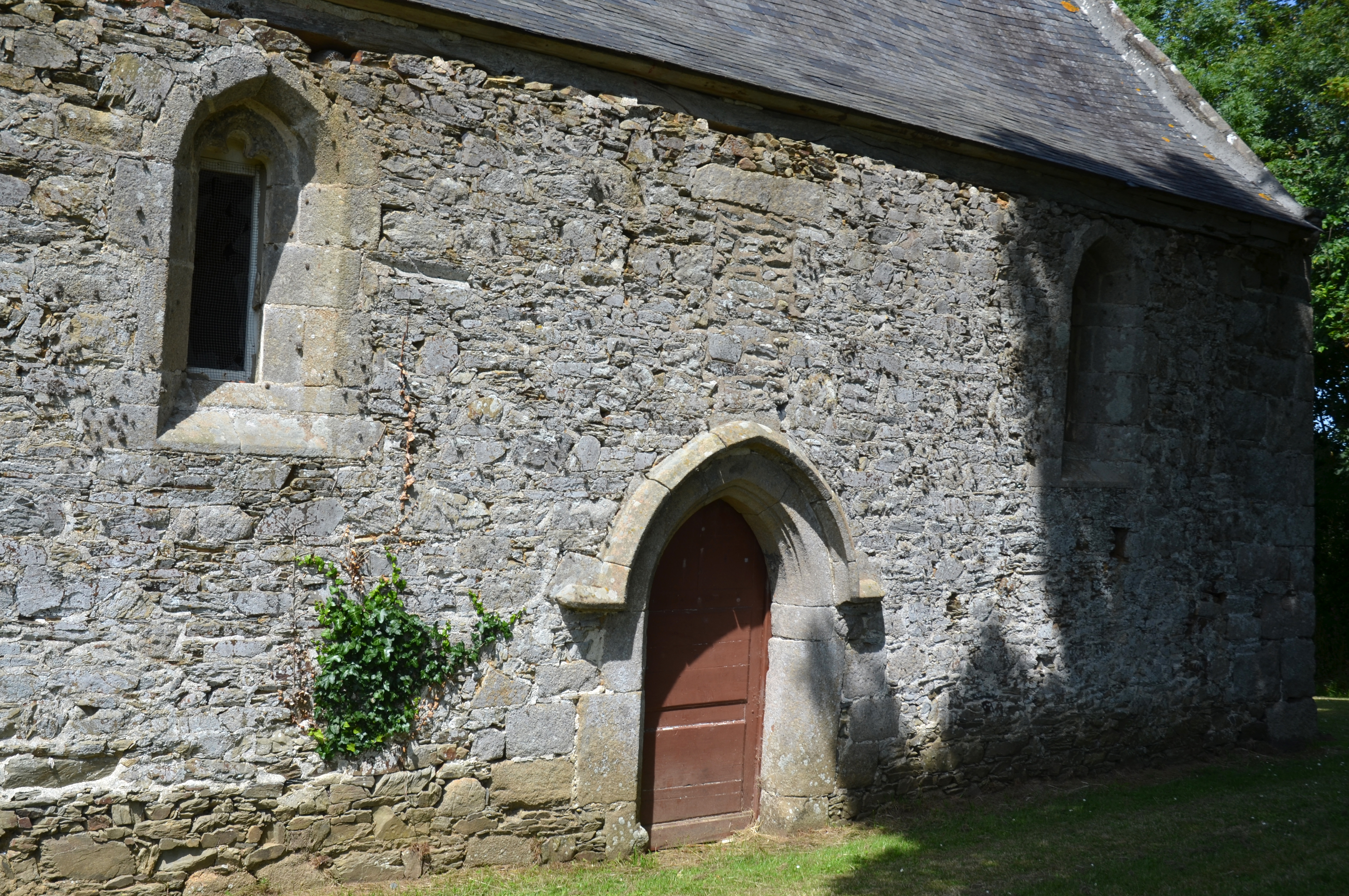 Langoat : chapelle Notre-Dame-du-Bois, élévation sud, porte en arc brisé surmontée d'une archivolte à retoursImmatriculation