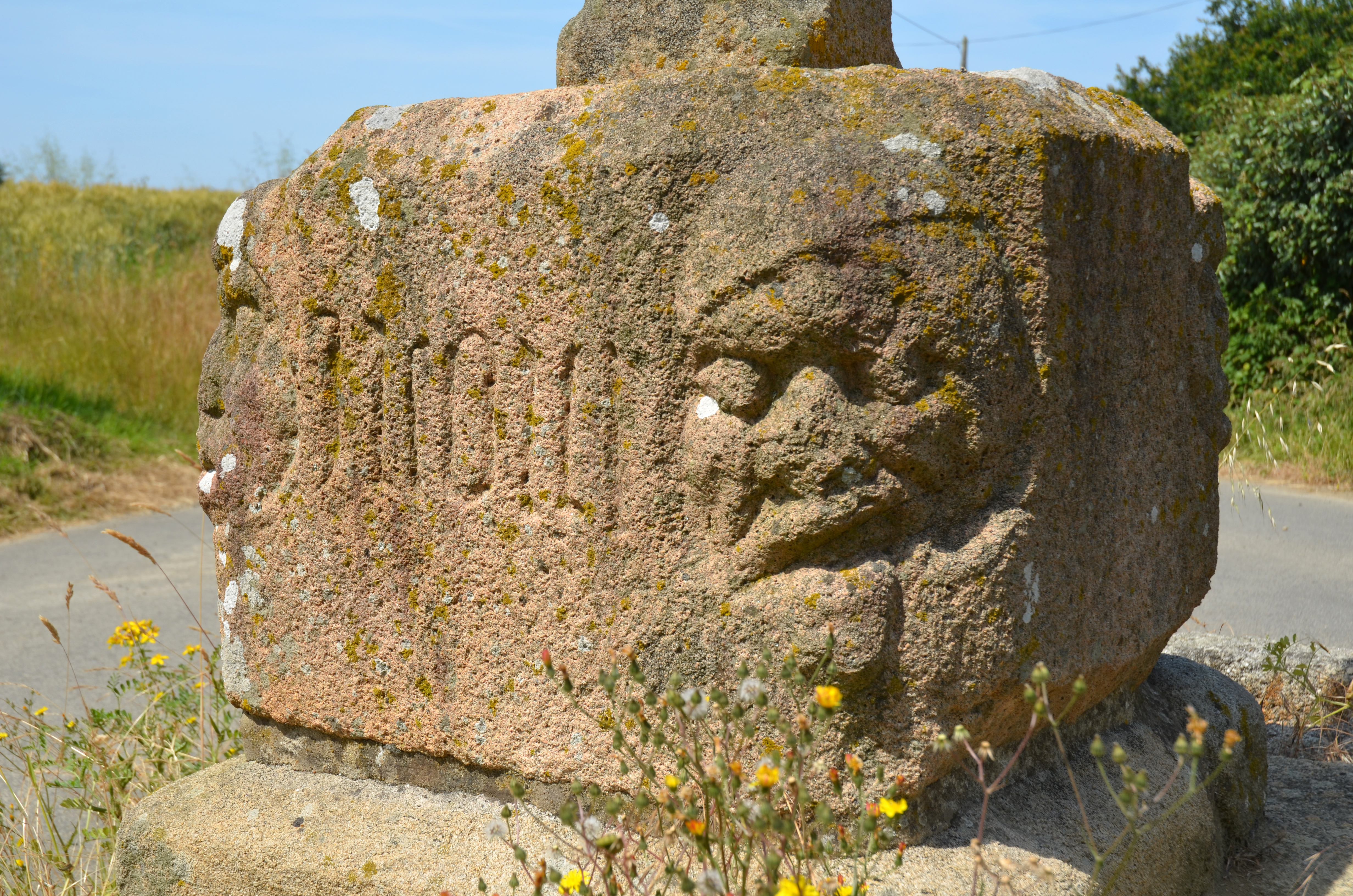 Langoat, carrefour des convenants Tano, Lucas et Pichoret : croix de chemin de Kervot, détail du socle sculptéImmatriculation