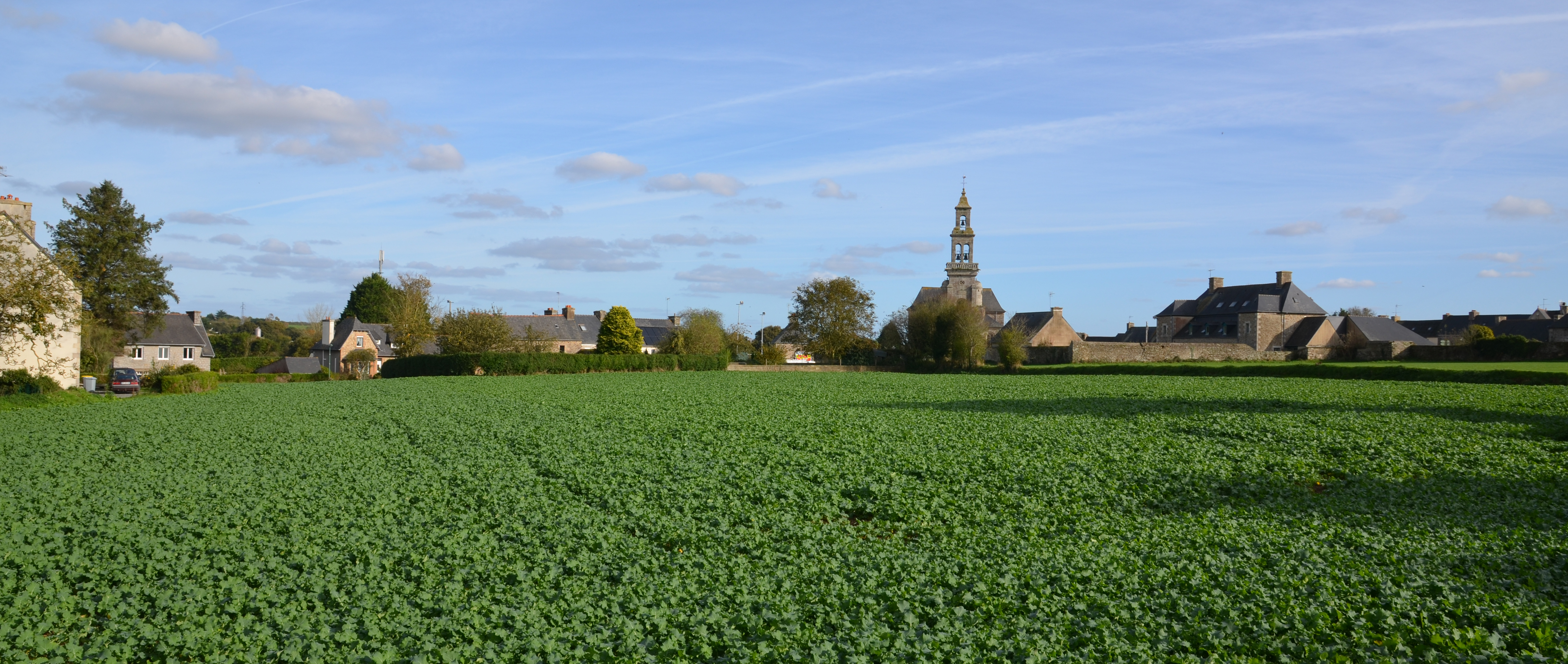 Langoat, le bourg (ouest) : vue de situation de l'église paroissiale et du presbytère, aujourd'hui mairie, depuis l'ouest-nord-ouestImmatriculation