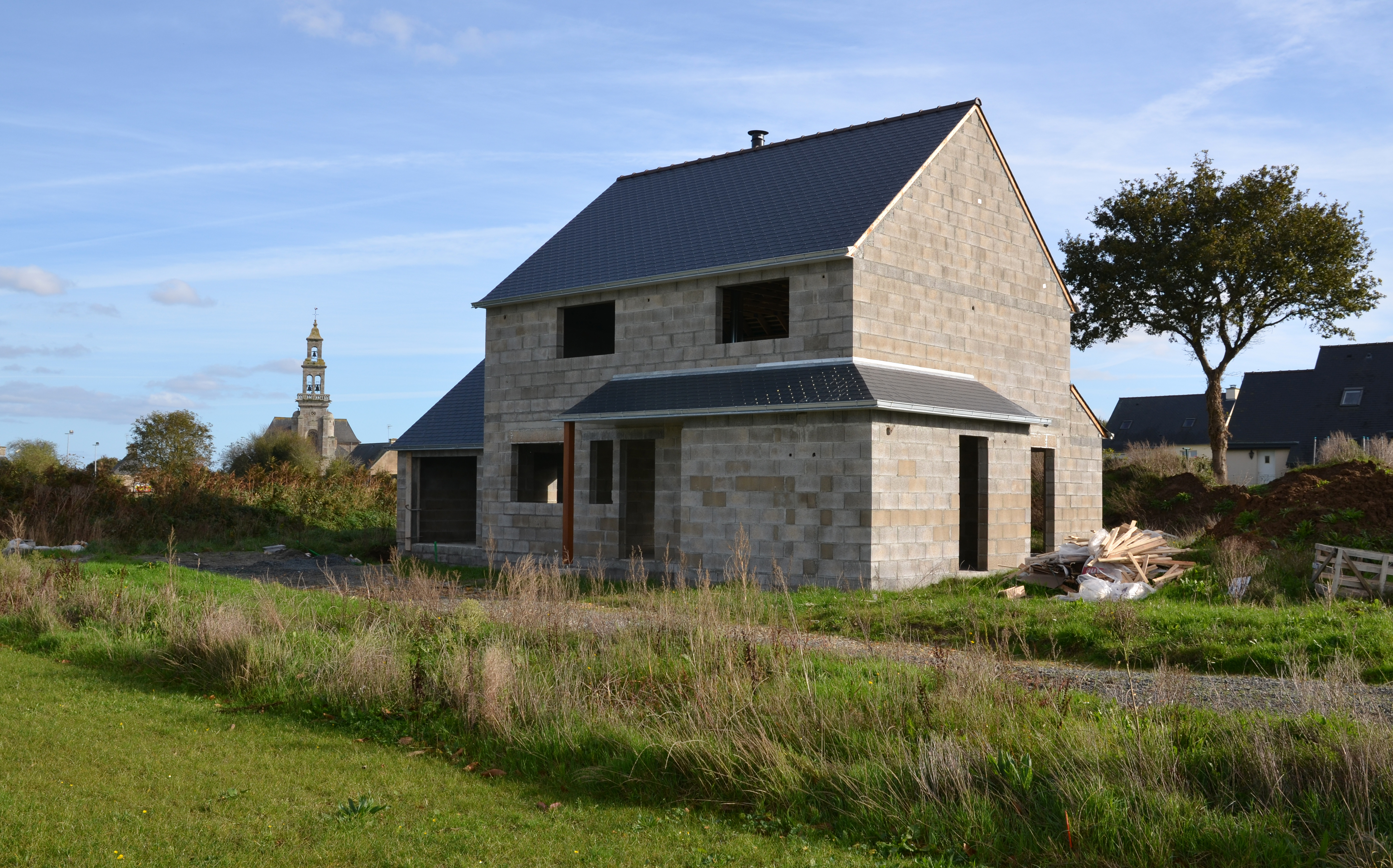 Langoat, le bourg (nord-ouest) : vue générale d'une maison du lotissement situé à l'ouest-nord-ouest du bourg. A l'arrière plan : l'église paroissialeImmatriculation