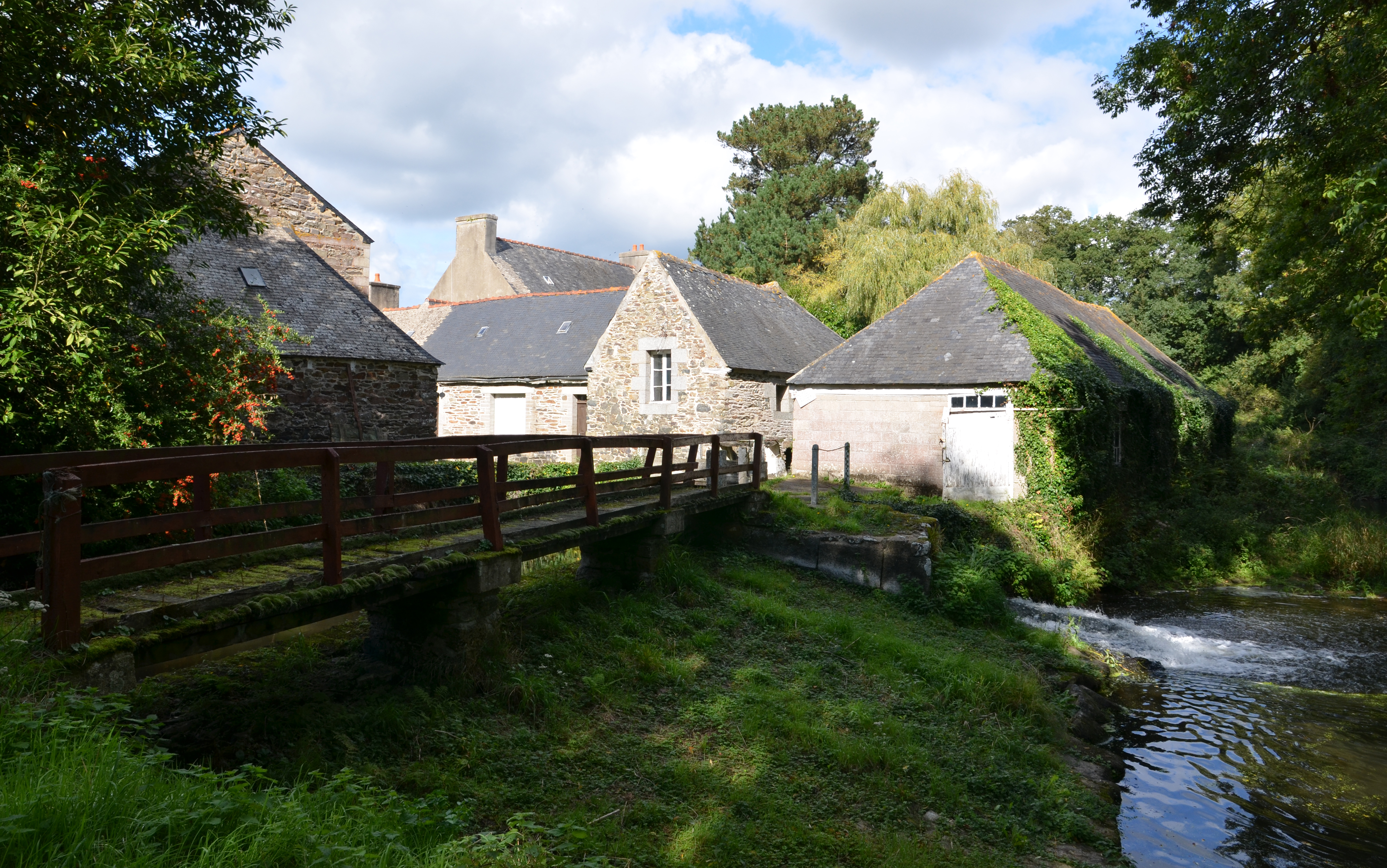 Langoat : Moulin Coz (ar Vilin Gozh), vue générale des bâtiments depuis le bief au sudImmatriculation