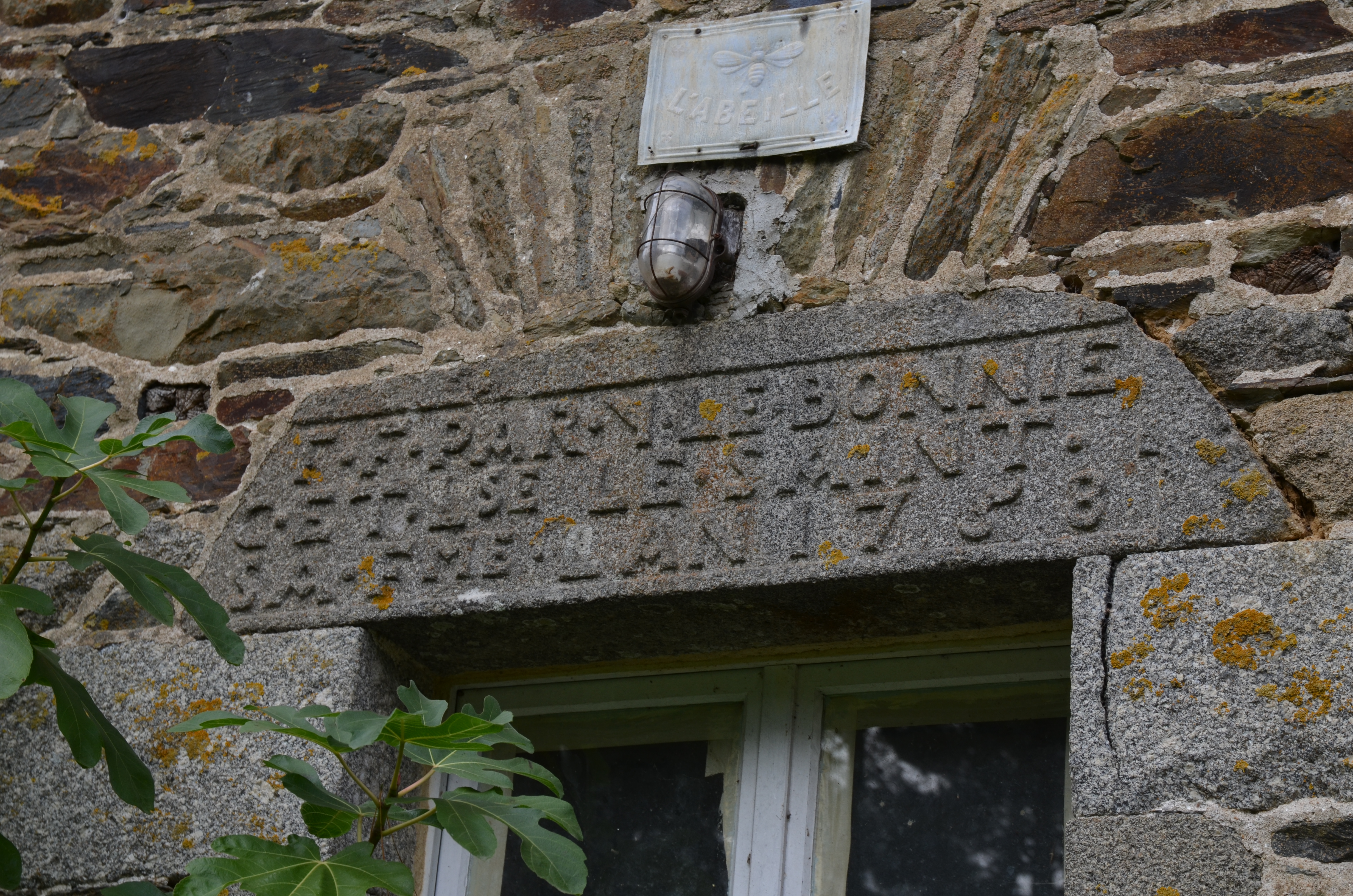 Langoat, Kermouster : manoir puis ferme, élévation orientée vers le sud-sud-est, travée centrale, porte. Le linteau porte l’inscription suivante : "F. F. PAR . Y. LE. BONNIE / C. ET. LSE[Louise]. LE. SAINT. SA. FME[Femme]. LAN 1758".Immatriculation