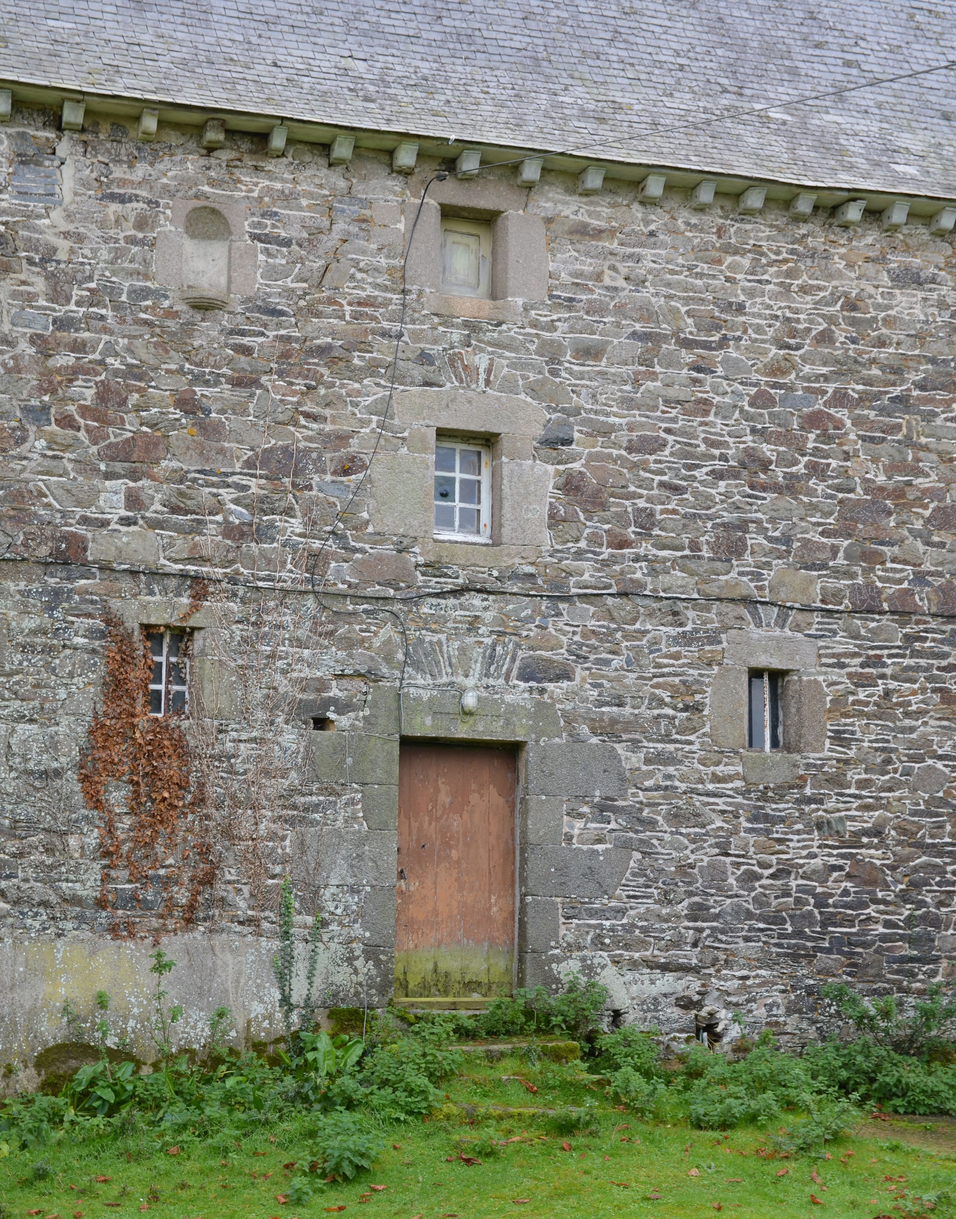 Langoat, Kermouster : manoir puis ferme, élévation orientée vers le nord-nord-ouest, travée centrale, porteImmatriculation