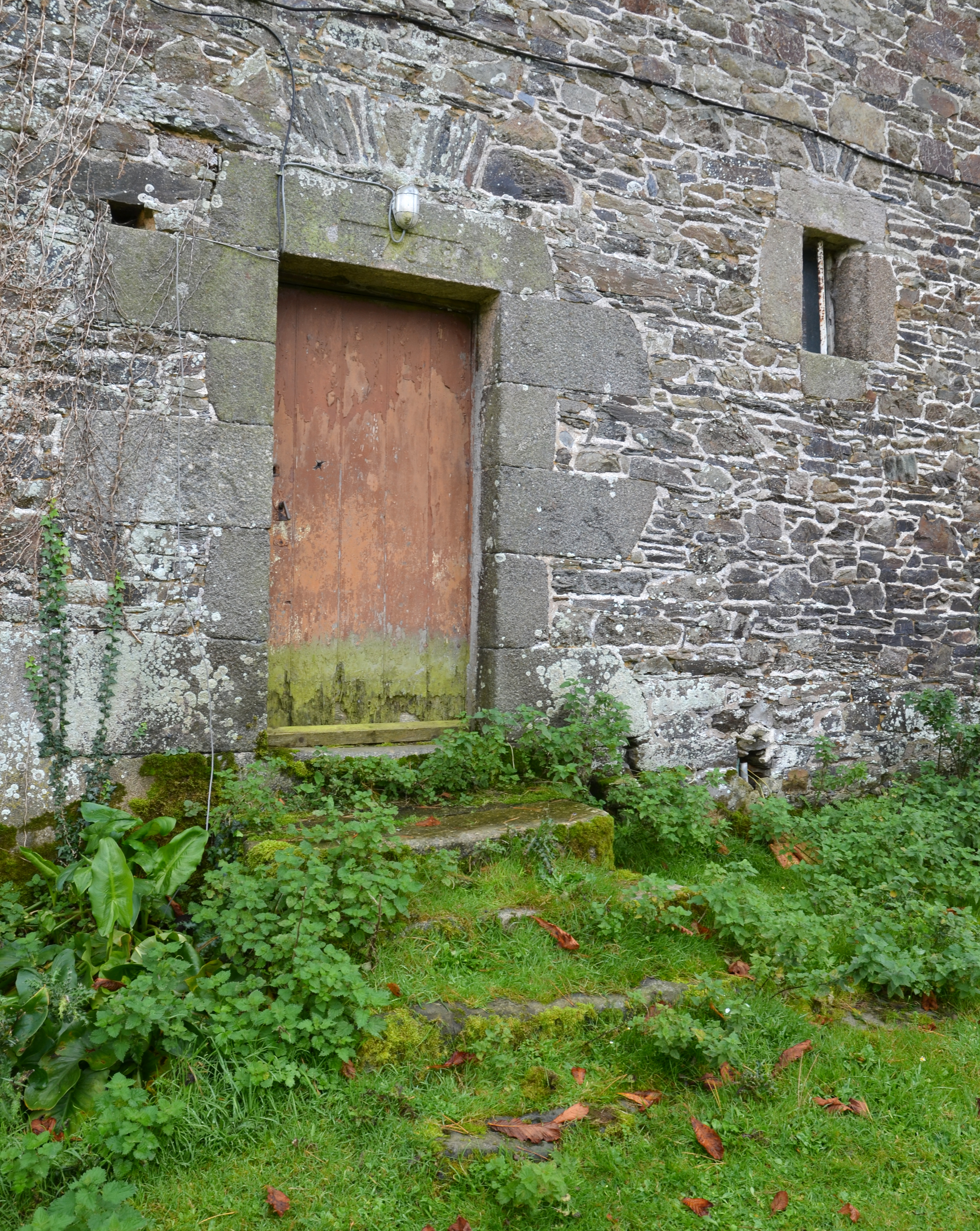 Langoat, Kermouster : manoir puis ferme, élévation orientée vers le nord-nord-ouest, travée centrale, porte. Le linteau porte le millésime "1758"Immatriculation