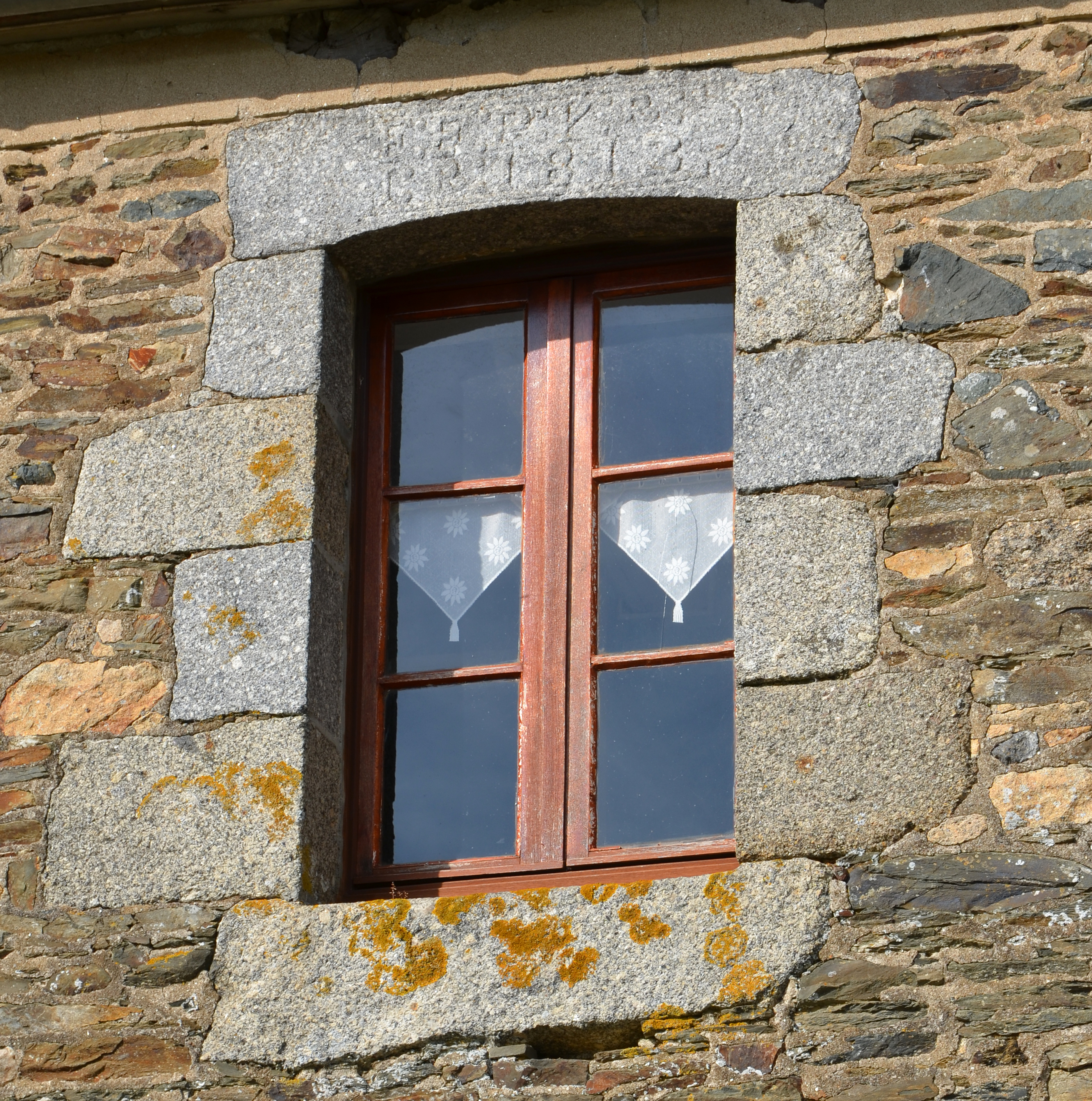 Langoat, Mez Huel : logis de ferme, élévation antérieure orientée vers le sud. Le linteau porte l'inscription suivante "F: F: P: Y: R: / I: R: 1812"Immatriculation
