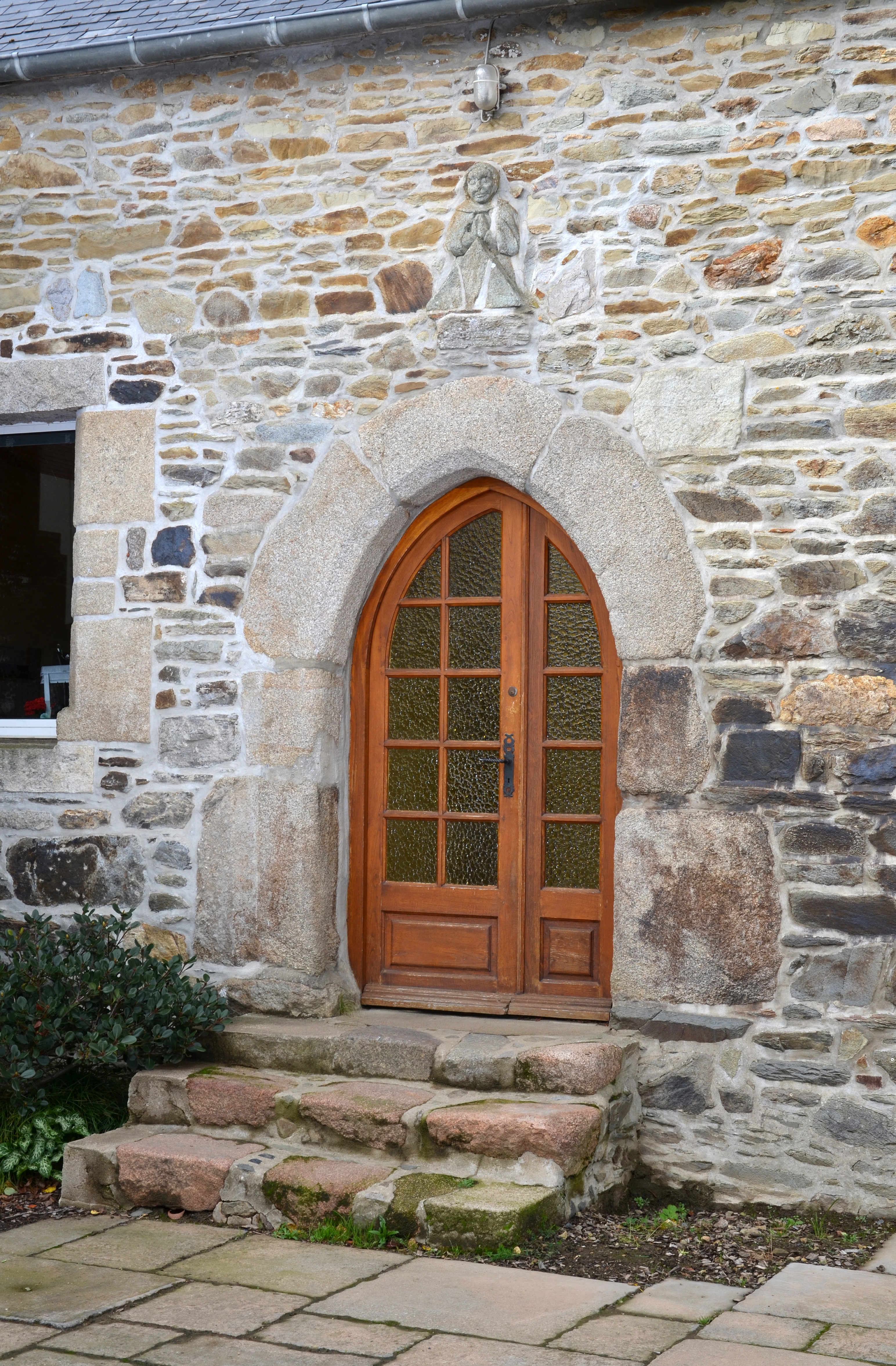 Langoat, Porz Ru (Porzh Ru) : logis, élévation antérieure orientée vers le sud, porte en arc brisé et statue de Saint YvesImmatriculation