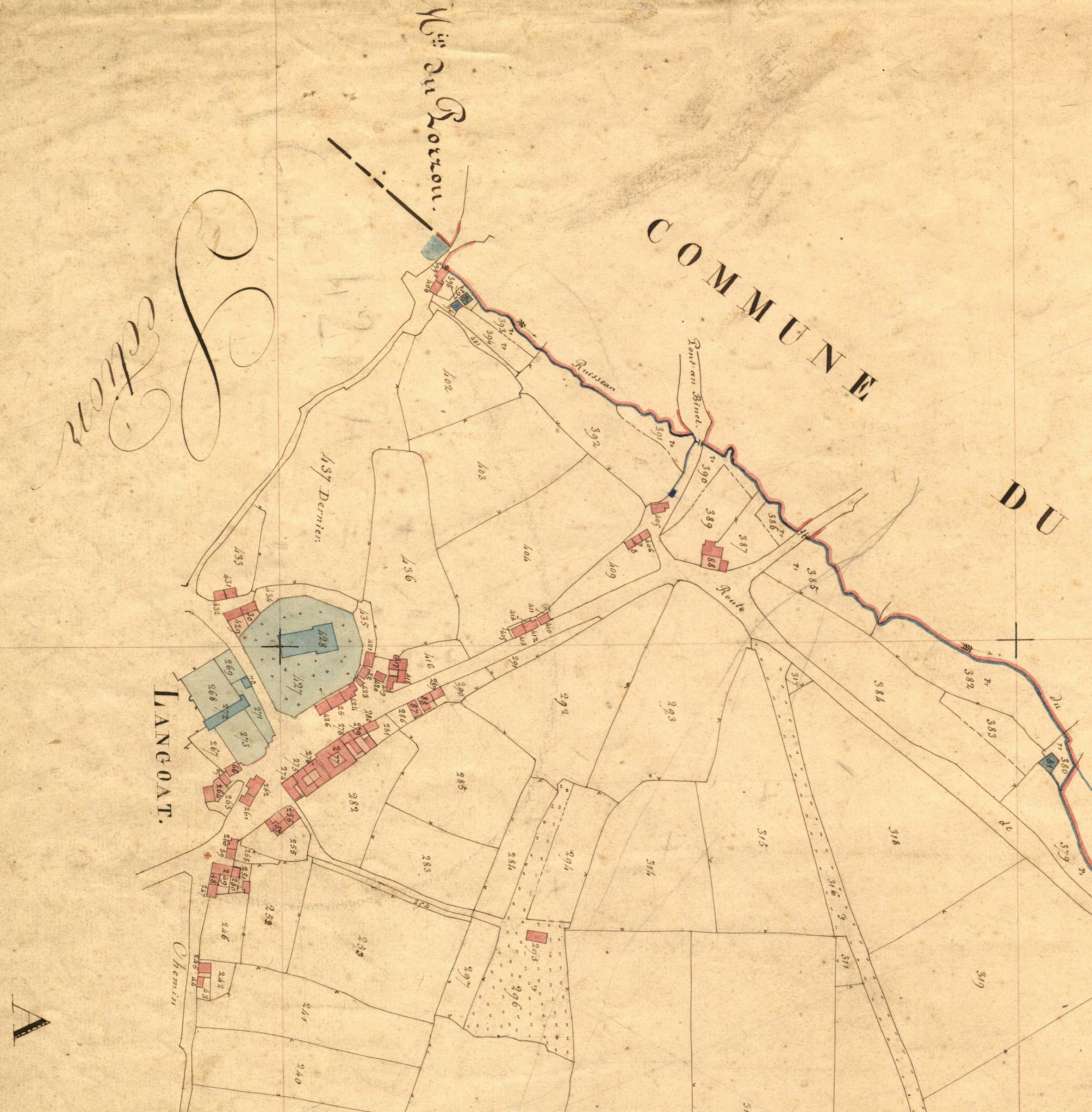 Extrait du cadastre ancien de la commune de Langoat, 1836 : le bourg de Langoat (centre et est)Immatriculation