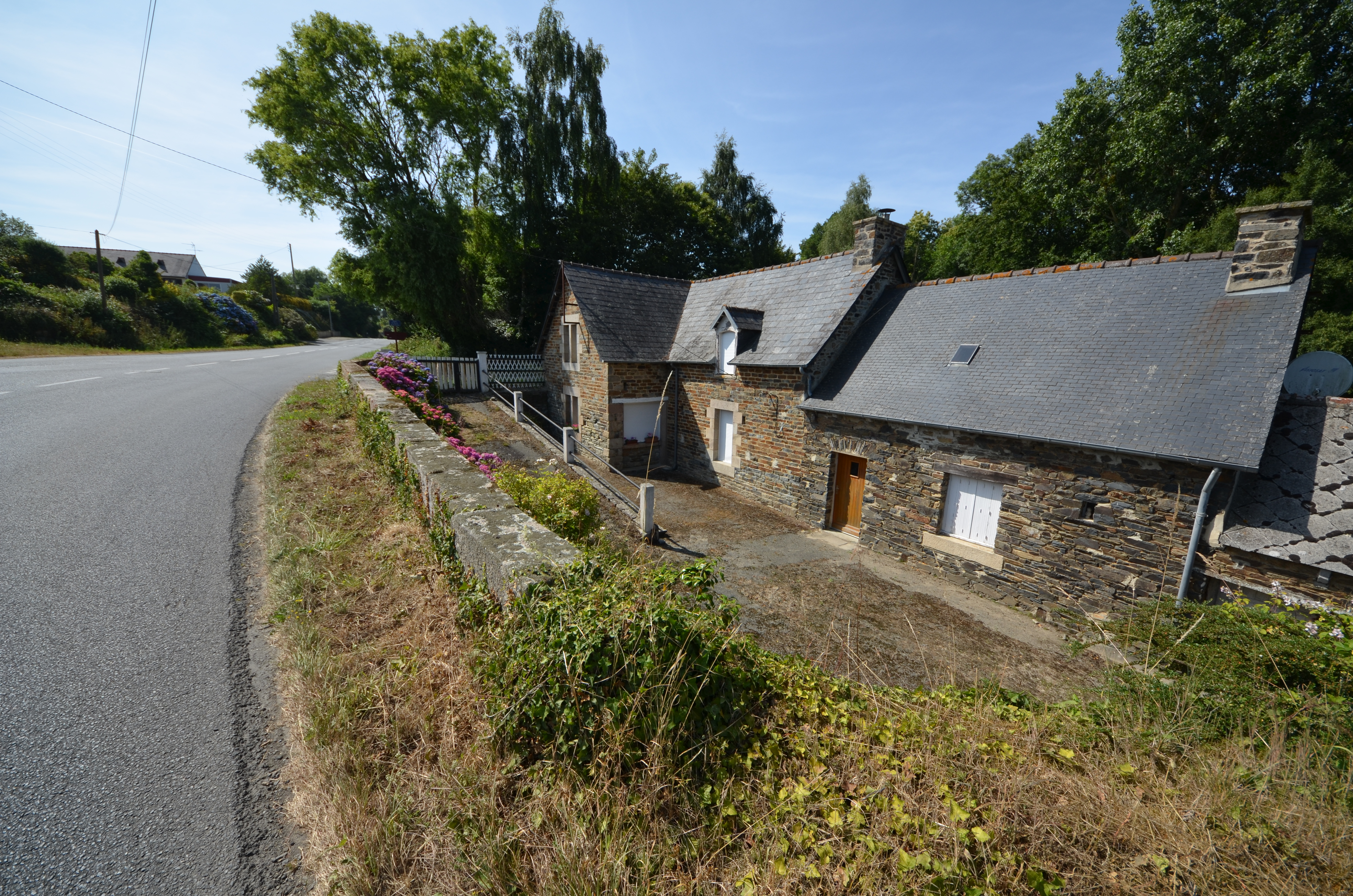 Langoat : moulin à eau de la Flèche (Milin Saezh), vue générale depuis l'est. L'édifice actuel porte une date, 1910 pour le logis et une inscription et un millésime sur une pierre de chaînage d'angle (illisible)Immatriculation