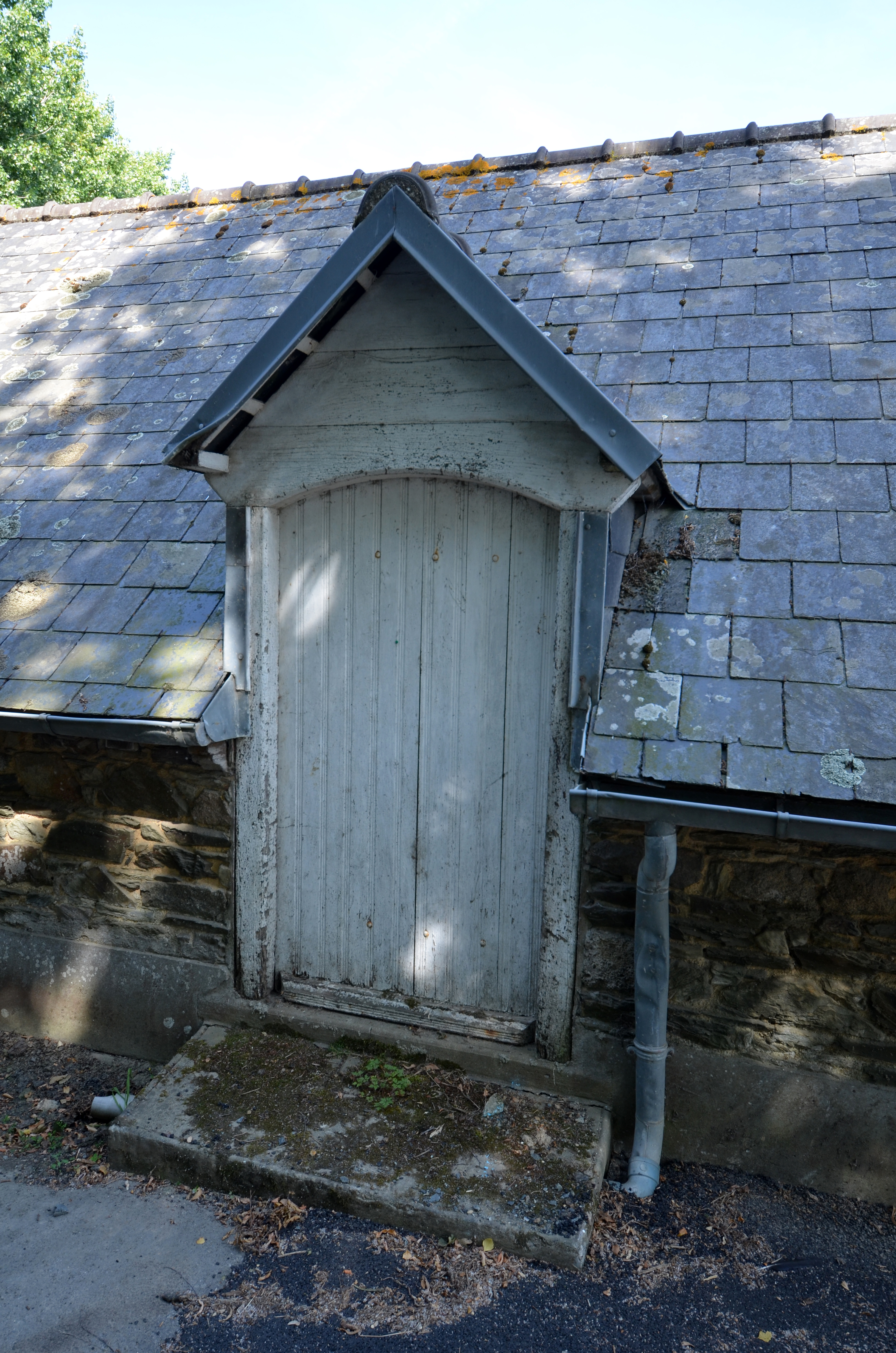 Langoat : moulin à eau de la Flèche (Milin Saezh), porte d'accès aux combles, linteau en bois en arc segmentaireImmatriculation