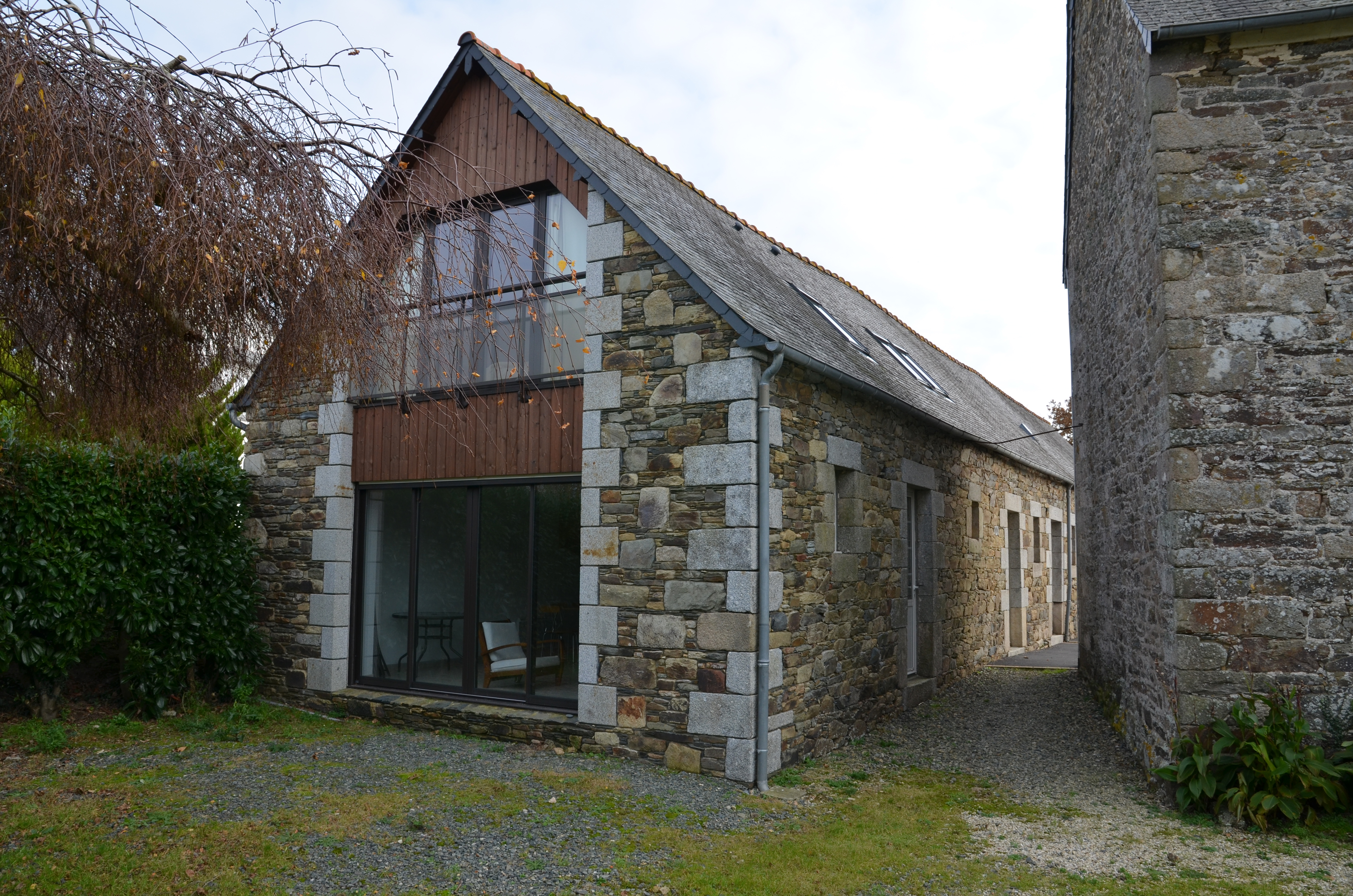 Langoat, Coat Croas (Koad Kroaz) : dépendance, élévation antérieure orientée vers l'ouest-sud-ouest. Elle porte le millésime "1845". Exemple d'intervention architecturale contemporaine sur le pignon nordImmatriculation