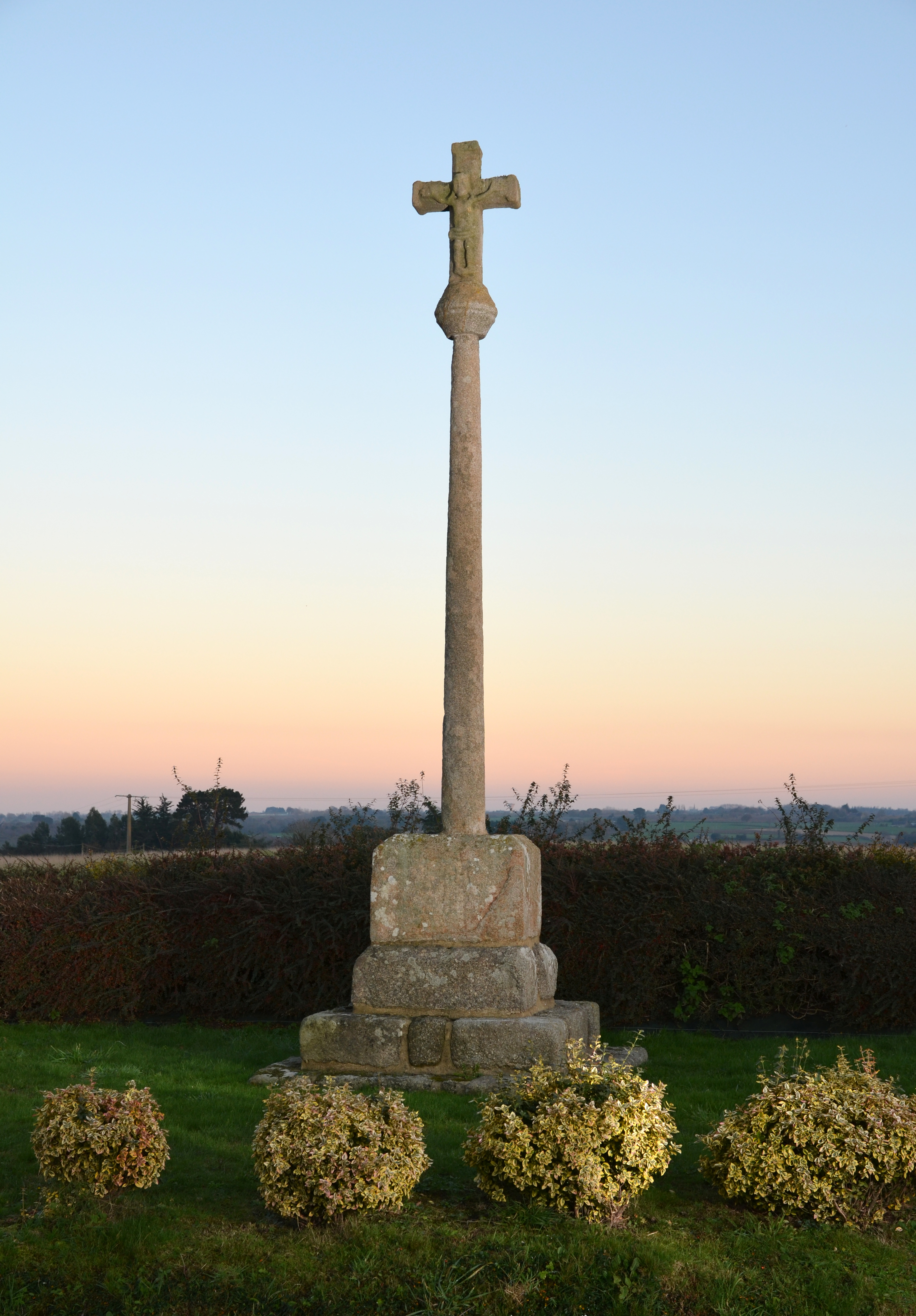 Mantallot, au nord de Bertu : croix de chemin nommée Croas Liben sur le cadastre de 1835. Face ouest : Christ en croixImmatriculation