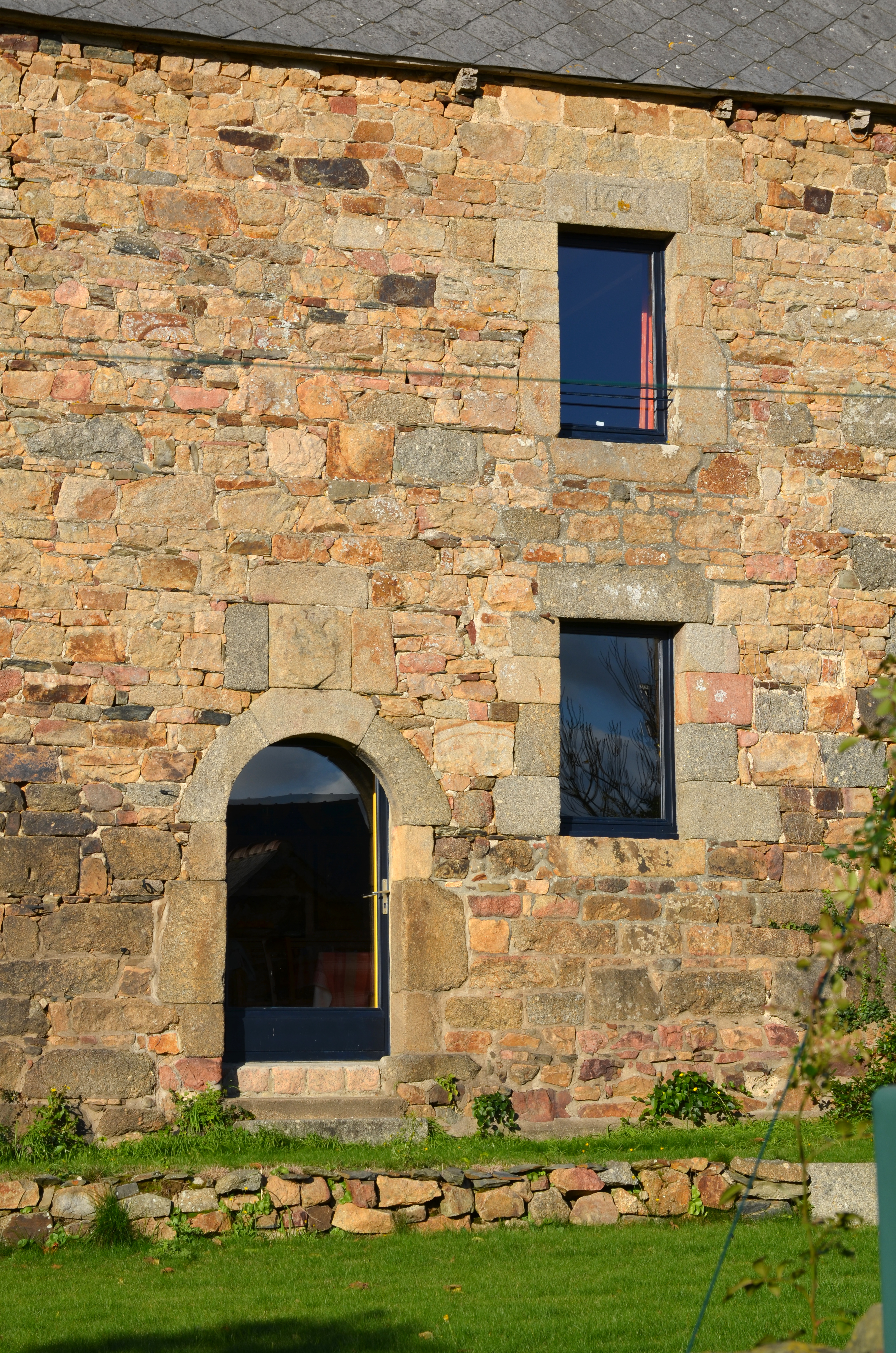 Mantallot, au nord du Bourg : manoir de Kerilis, élévation antérieure orientée vers le sud, vue de détail des ouvertures de la partie est. La porte en arc plein cintre, datable du 17e siècle est surmontée d'armoiries aujourd'hui illisiblesImmatriculation