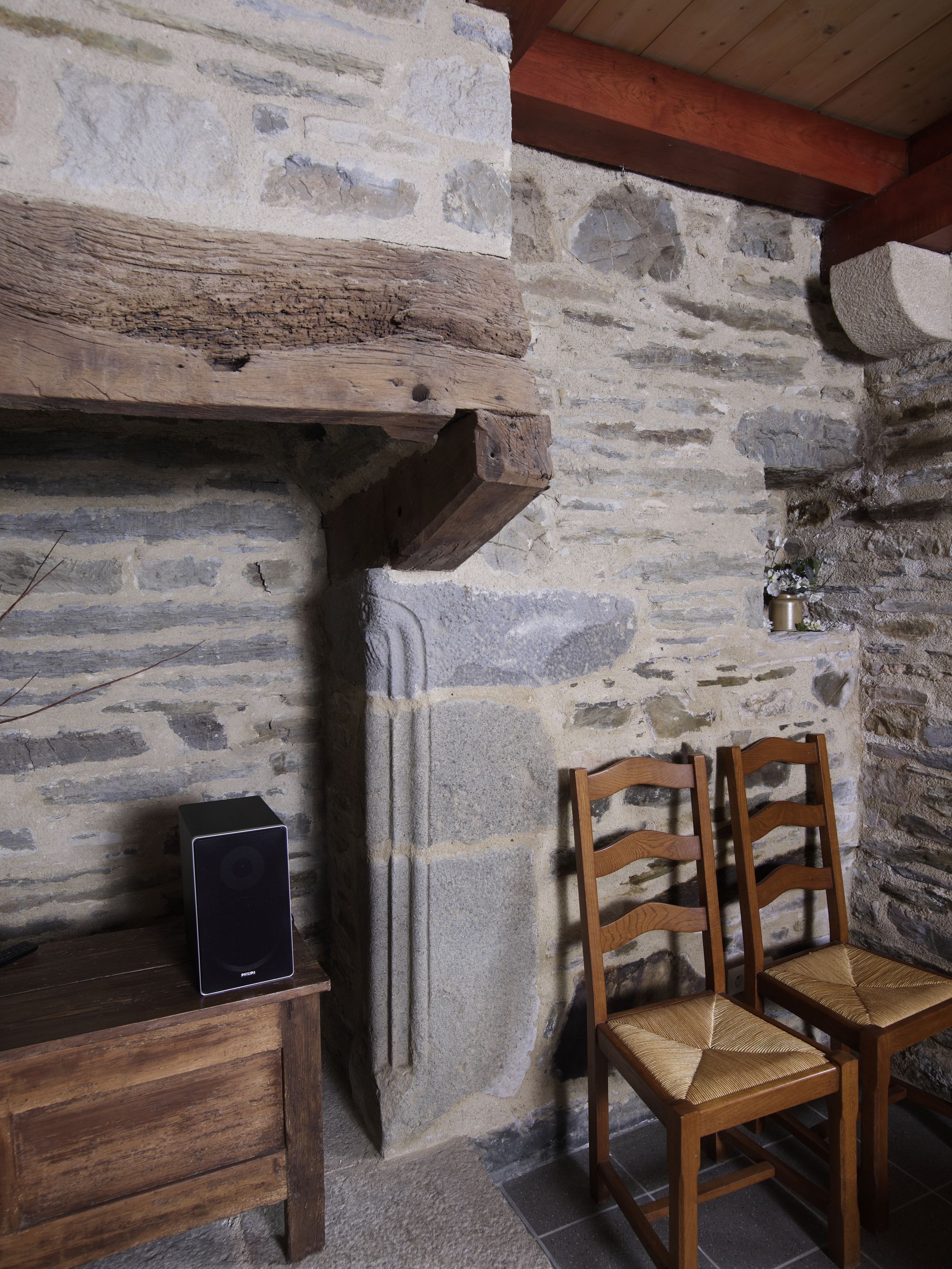 Place de la mairie. Maison à rangs de boulins en façade, fin 16e siècle-début 17e siècle (actuelle mairie). Détail de la cheminée du rez-de-chausséeImmatriculation