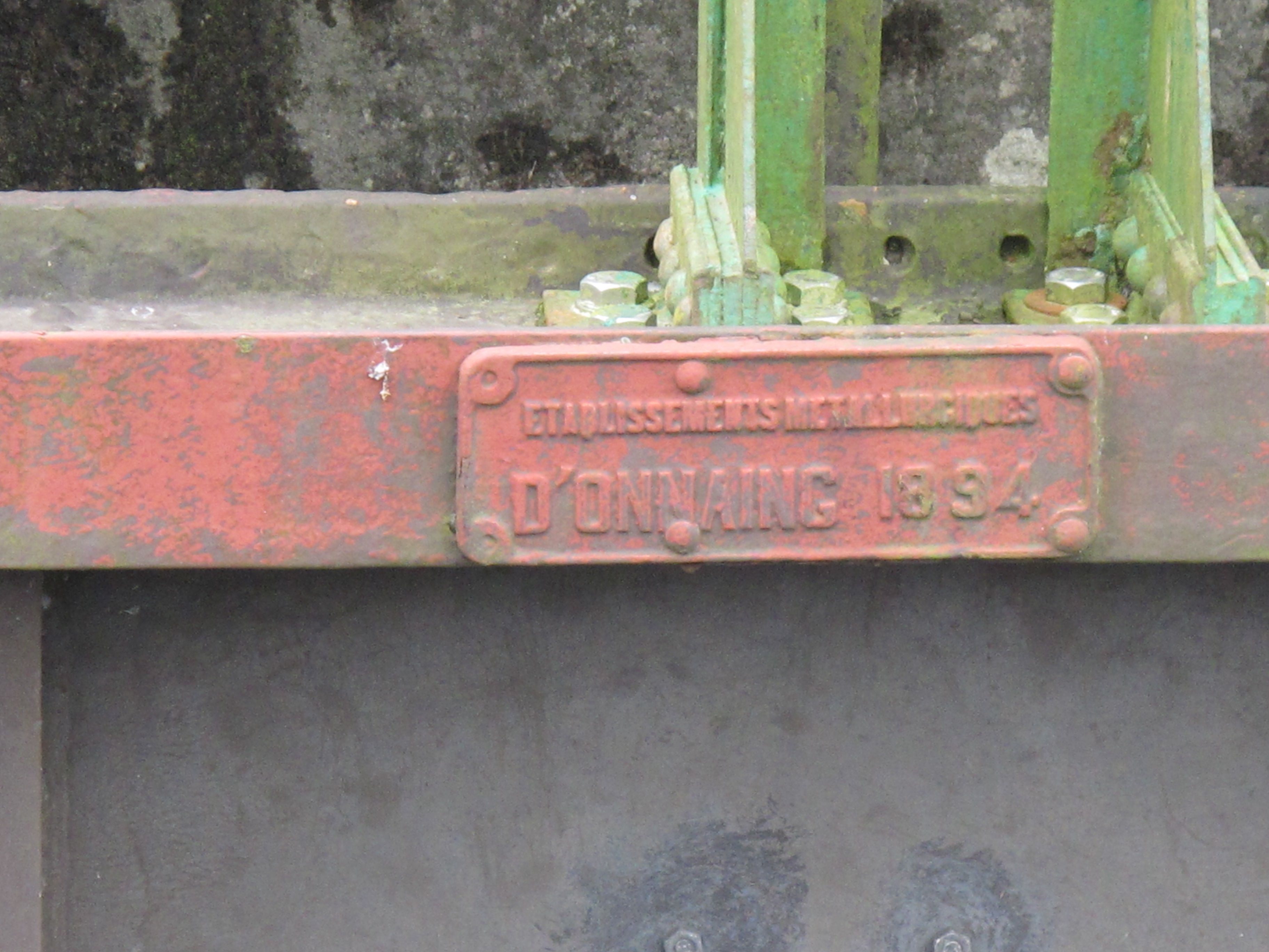 Prat-hir, détail de la porte d'écluse, marque : Etablissements métallurgiques d'Onnaing, 1894.Immatriculation