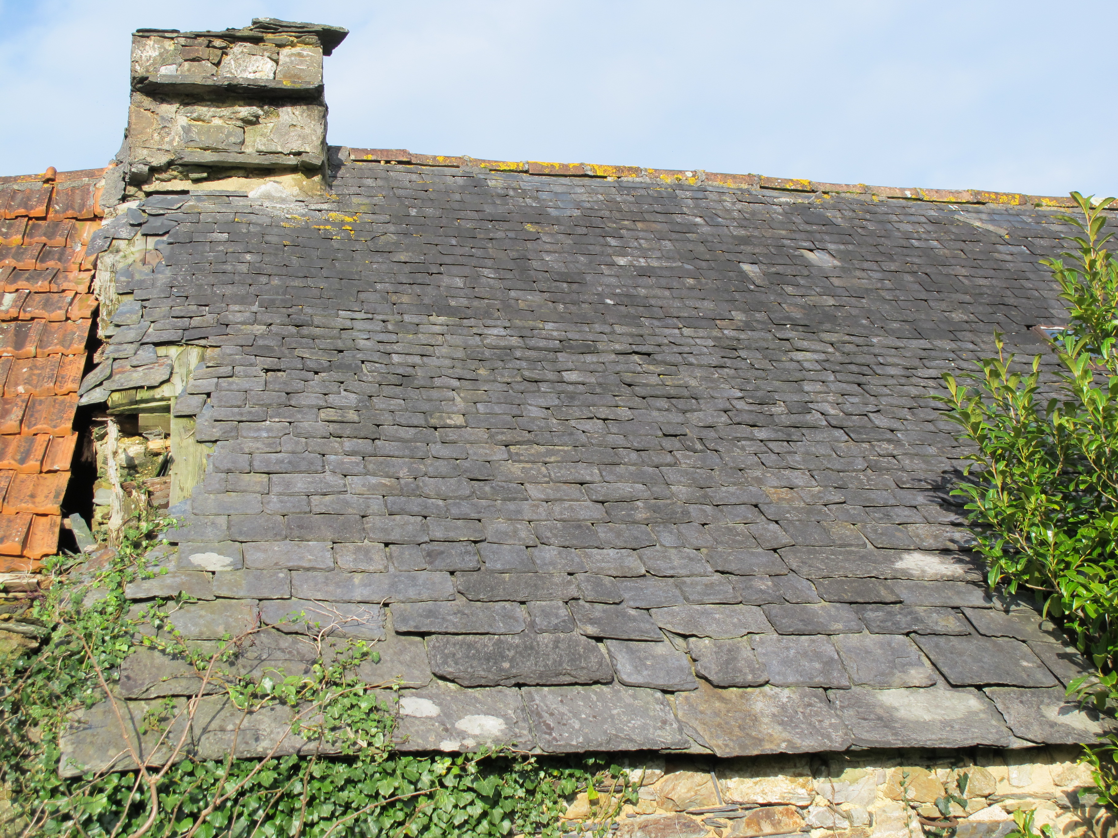 Détail du toit en ardoise de montagne, à pureaux décroissantsImmatriculation