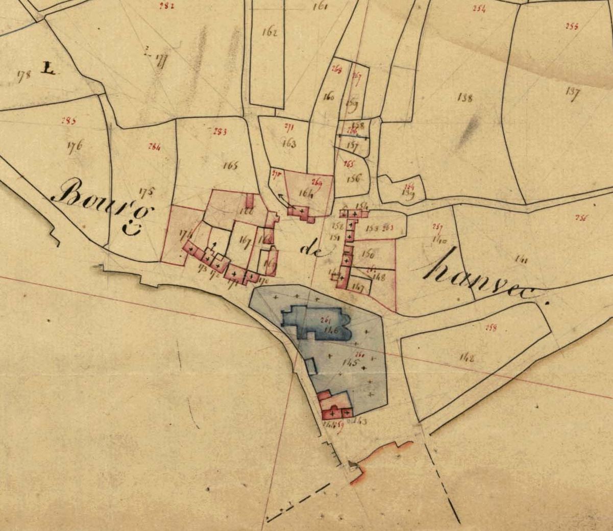 Partie nord du bourg en 1824. Extrait du cadastre ancien (A.D. 29, série 3P 2/19. Section B1)Immatriculation