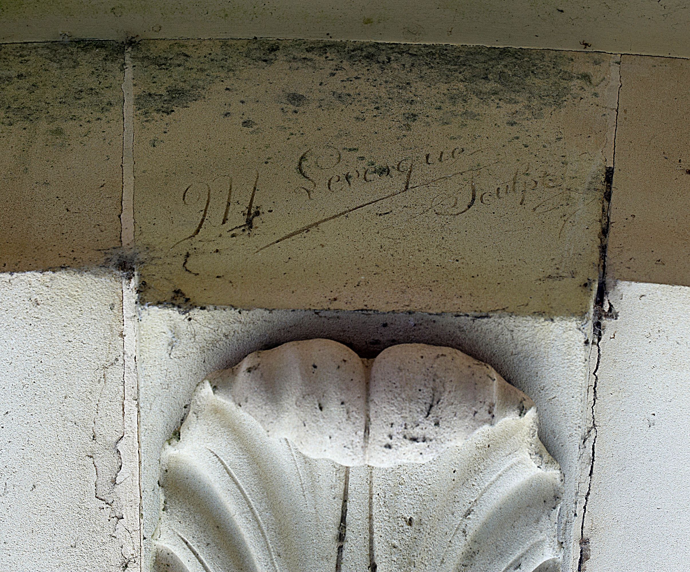 Porche d'entrée : inscription portée sur le claveau feuillagé : "M Levesque Sculpt"Immatriculation