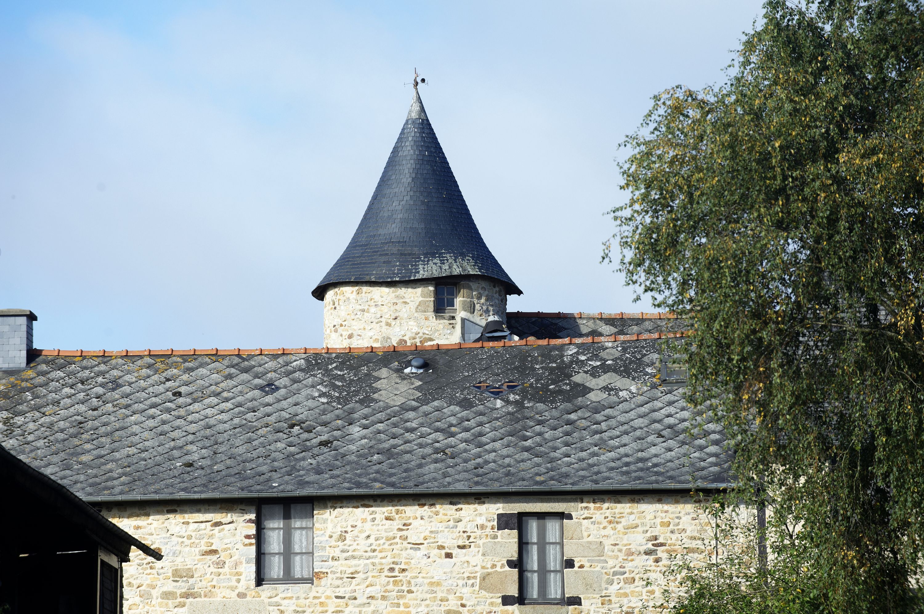 Vue Est du manoir, détail des toitures de la façade principale et de la tour d'escalierImmatriculation